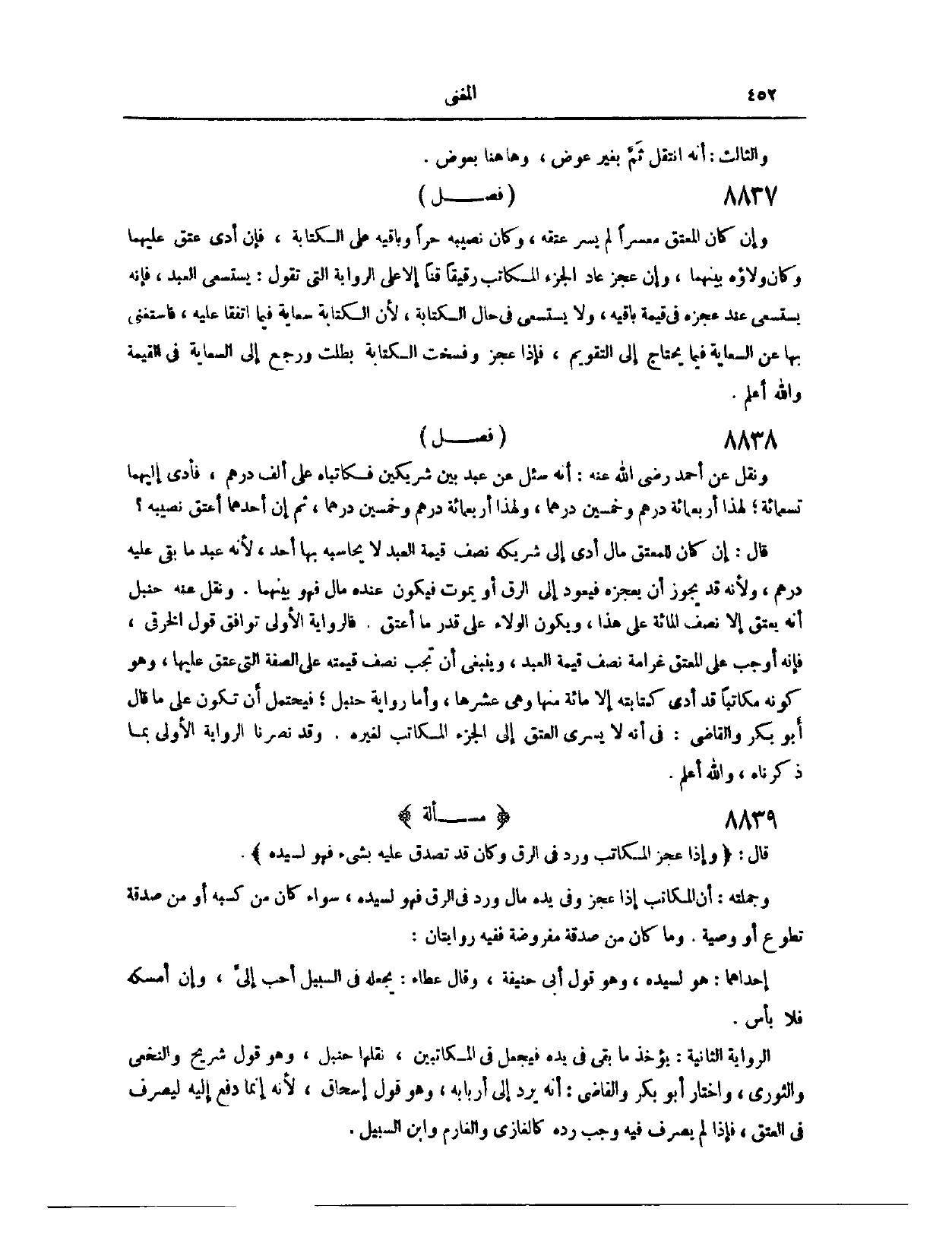 (٨٨٢٧) فَصْلٌ: وَنُقِلَ عَنْ أَحْمَدَ - رَضِيَ اللَّهُ عَنْهُ - أَنَّهُ سُئِلَ عَنْ عَبْدٍ بَيْنَ شَرِيكَيْنِ، فَكَاتَبَاهُ عَلَى أَلْفِ دِرْهَمٍ، فَأَدَّى إلَيْهِمَا تِسْعَمِائَةٍ؛ لِهَذَا أَرْبَعُمِائَةِ دِرْهَمٍ وَخَمْسِينَ دِرْهَمًا وَلِهَذَا أَرْبَعُمِائَةِ دِرْهَمٍ وَخَمْسِينَ دِرْهَمًا ثُمَّ إنَّ أَحَدَهُمَا، أَعْتَقَ نَصِيبَهُ؟ قَالَ: إنْ كَانَ لِلْمُعْتِقِ مَالٌ، أَدَّى إلَى شَرِيكِهِ نِصْفَ قِيمَةِ الْعَبْدِ، لَا يُحَاسِبُهُ بِهَا أَحَدٌ؛ لِأَنَّهُ عَبْدٌ مَا بَقِيَ عَلَيْهِ دِرْهَمٌ، وَلِأَنَّهُ قَدْ يَجُوزُ أَنْ يُعَجِّزَهُ، فَيَعُودَ إلَى الرِّقِّ، أَوْ يَمُوتَ، فَيَكُونَ عِنْدَهُ مَالٌ، فَهُوَ بَيْنَهُمَا. وَنَقَلَ عَنْهُ حَنْبَلٌ، أَنَّهُ يَعْتِقُ إلَّا نِصْفَ الْمِائَةِ عَلَى هَذَا، وَيَكُونُ الْوَلَاءُ عَلَى قَدْرِ مَا أَعْتَقَ. فَالرِّوَايَةُ الْأُولَى تُوَافِقُ قَوْلَ الْخِرَقِيِّ، فَإِنَّهُ أَوْجَبَ عَلَى الْمُعْتِقِ غَرَامَةَ نِصْفِ قِيمَةِ الْعَبْدِ. وَيَنْبَغِي أَنْ تَجِبَ نِصْفُ قِيمَتِهِ، عَلَى الصِّفَةِ الَّتِي عَتَقَ عَلَيْهَا، وَهُوَ كَوْنُهُ مُكَاتَبًا، قَدْ أَدَّى كِتَابَتَهُ إلَّا مِائَةً مِنْهَا، وَهِيَ عُشْرُهَا.
