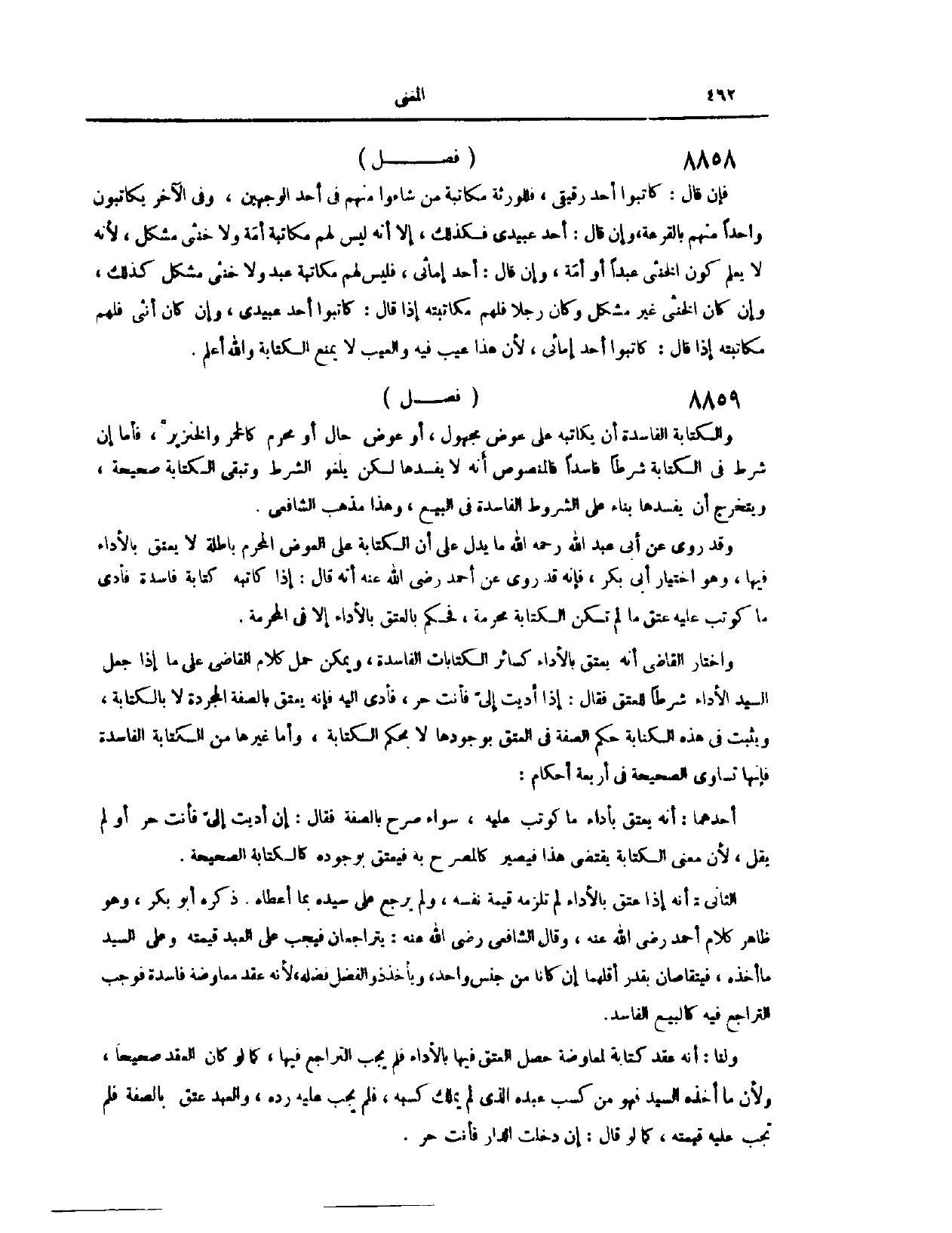 فَصْلٌ: وَالْكِتَابَةُ الْفَاسِدَةُ، أَنْ يُكَاتِبَهُ عَلَى عِوَضٍ مَجْهُولٍ، أَوْ عِوَضٍ حَالٍّ، أَوْ مُحَرَّمٍ، كَالْخَمْرِ وَالْخِنْزِيرِ. فَأَمَّا إنْ شَرَطَ فِي الْكِتَابَةِ شَرْطًا فَاسِدًا، فَالْمَنْصُوصُ أَنَّهُ لَا يُفْسِدُهَا لَكِنْ يَلْغُو الشَّرْطُ، وَتَبْقَى الْكِتَابَةُ صَحِيحَةً. وَيَتَخَرَّجُ أَنْ يُفْسِدَهَا؛ بِنَاءً عَلَى الشُّرُوطِ الْفَاسِدَةِ فِي الْبَيْعِ. وَهَذَا مَذْهَبُ الشَّافِعِيِّ وَقَدْ رُوِيَ عَنْ أَبِي عَبْدِ اللَّهِ، رَحِمَهُ اللَّهُ، مَا يَدُلُّ عَلَى أَنَّ الْكِتَابَةَ عَلَى الْعِوَضِ الْمُحَرَّمِ بَاطِلَةٌ، لَا يَعْتِقُ بِالْأَدَاءِ فِيهَا. وَهُوَ اخْتِيَارُ أَبِي بَكْرٍ؛ فَإِنَّهُ قَدْ رَوَى عَنْ أَحْمَدَ - رَضِيَ اللَّهُ عَنْهُ - أَنَّهُ قَالَ: إذَا كَاتَبَهُ كِتَابَةً فَاسِدَةً، فَأَدَّى مَا كُوتِبَ عَلَيْهِ، عَتَقَ، مَا لَمْ تَكُنْ الْكِتَابَةُ مُحَرَّمَةً. فَحَكَمَ بِالْعِتْقِ بِالْأَدَاءِ إلَّا فِي الْمُحَرَّمَةِ. وَاخْتَارَ الْقَاضِي أَنَّهُ يَعْتِقُ بِالْأَدَاءِ، كَسَائِرِ الْكِتَابَاتِ الْفَاسِدَةِ.