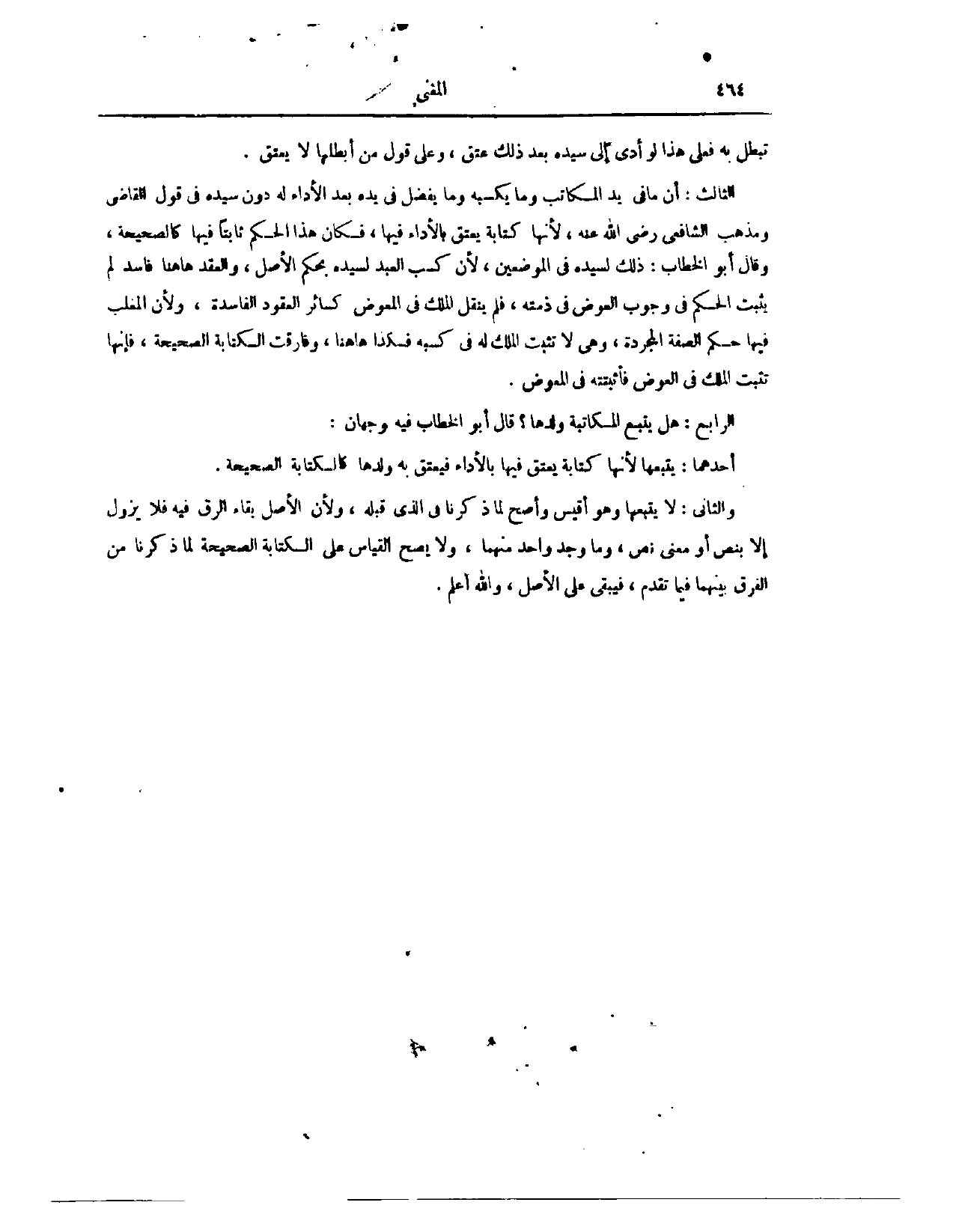 الثَّالِثُ، أَنَّ مَا فِي يَدِ الْمُكَاتَبِ وَمَا يَكْسِبُهُ، وَمَا يَفْضُلُ فِي يَدِهِ بَعْدَ الْأَدَاءِ، لَهُ دُونَ سَيِّدِهِ. فِي قَوْلِ الْقَاضِي، وَمَذْهَبُ الشَّافِعِيِّ - رَضِيَ اللَّهُ عَنْهُ - لِأَنَّهَا كِتَابَةٌ يَعْتِقُ بِالْأَدَاءِ فِيهَا، فَكَانَ هَذَا الْحُكْمُ ثَابِتًا فِيهَا، كَالصَّحِيحَةِ. وَقَالَ أَبُو الْخَطَّابِ: ذَلِكَ لِسَيِّدِهِ فِي الْمَوْضِعَيْنِ؛ لِأَنَّ كَسْبَ الْعَبْدِ لِسَيِّدِهِ، بِحُكْمِ الْأَصْلِ، وَالْعَقْدُ هَاهُنَا فَاسِدٌ، لَمْ يَثْبُتْ الْحُكْمُ فِي وُجُوبِ الْعِوَضِ فِي ذِمَّتِهِ، فَلَمْ يُنْقَلْ الْمِلْكُ فِي الْمُعَوَّضِ كَسَائِرِ، الْعُقُودِ الْفَاسِدَةِ، وَلِأَنَّ الْمُغَلَّبَ فِيهَا حُكْمُ الصِّفَةِ الْمُجَرَّدَةِ، وَهِيَ لَا تُثْبِتُ الْمِلْكَ لَهُ فِي كَسْبِهِ، فَكَذَا هَاهُنَا، وَفَارَقَتْ الْكِتَابَةَ الصَّحِيحَةَ، فَإِنَّهَا تُثْبِتُ الْمِلْكَ فِي الْعِوَضِ، فَأَثْبَتَتْهُ فِي الْمُعَوَّضِ. الرَّابِعُ، هَلْ يَتْبَعُ الْمُكَاتَبَةَ وَلَدُهَا؟ قَالَ أَبُو الْخَطَّابِ: فِيهِ وَجْهَانِ؛ أَحَدُهُمَا، يَتْبَعُهَا؛ لِأَنَّهَا كِتَابَةٌ يَعْتِقُ فِيهَا بِالْأَدَاءِ، فَيَعْتِقُ بِهِ وَلَدُهَا، كَالْكِتَابَةِ الصَّحِيحَةِ، وَالثَّانِي، لَا يَتْبَعُهَا. وَهُوَ أَقْيَسُ، وَأَصَحُّ؛ لِمَا ذَكَرْنَا فِي الَّذِي قَبْلَهُ، وَلِأَنَّ الْأَصْلَ بَقَاءُ الرِّقِّ فِيهِ، فَلَا يَزُولُ إلَّا بِنَصِّ، أَوْ مَعْنَى نَصٍّ، وَمَا وُجِدَ وَاحِدٌ مِنْهُمَا، وَلَا يَصِحُّ الْقِيَاسُ عَلَى الْكِتَابَةِ الصَّحِيحَةِ؛ لِمَا ذَكَرْنَا مِنْ الْفَرْقِ بَيْنَهُمَا فِيمَا تَقَدَّمَ، فَيَبْقَى عَلَى الْأَصْلِ. وَاَللَّهُ أَعْلَمُ.
