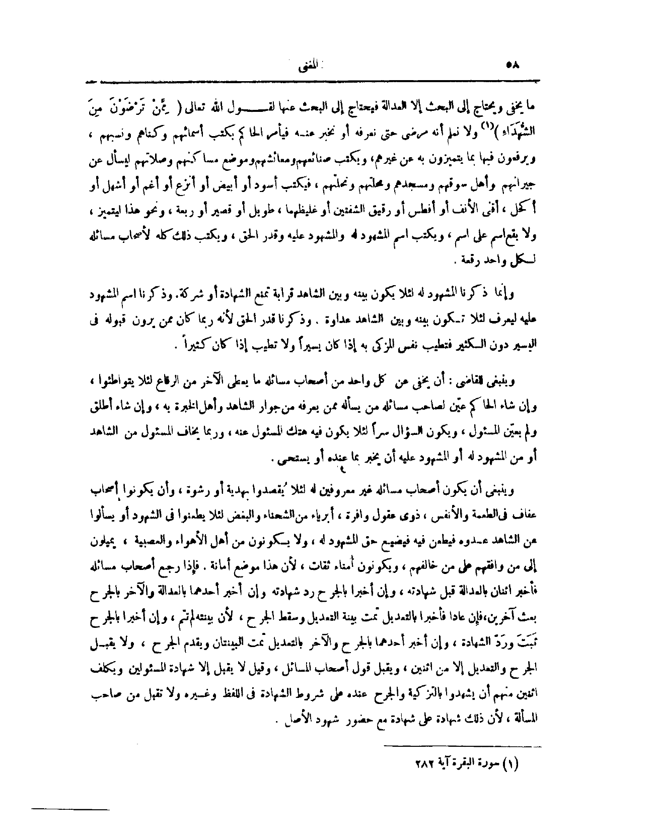 مَا يَخْفَى وَيَحْتَاجُ إلَى الْبَحْثِ إلَّا الْعَدَالَةُ، فَيَحْتَاجُ إلَى الْبَحْثِ عَنْهَا؛ لِقَوْلِ اللَّهِ تَعَالَى: {مِمَّنْ تَرْضَوْنَ مِنَ الشُّهَدَاءِ} [البقرة: ٢٨٢] . وَلَا نَعْلَمُ أَنَّهُ مَرْضِيٌّ حَتَّى نَعْرِفَهُ، أَوْ نُخْبَرَ عَنْهُ، فَيَأْمُرُ الْحَاكِمُ بِكَتْبِ أَسْمَائِهِمْ، وَكُنَاهُمْ، وَنَسَبِهِمْ، وَيُرْفَعُونَ فِيهَا بِمَا يَتَمَيَّزُونَ بِهِ عَنْ غَيْرِهِمْ، وَيَكْتُبُ صَنَائِعَهُمْ، وَمَعَايِشَهُمْ، وَمَوْضِعَ مَسَاكِنِهِمْ، وَصَلَاتِهِمْ؛ لِيَسْأَلَ عَنْ جِيرَانِهِمْ، وَأَهْلِ سُوقِهِمْ وَمَسْجِدِهِمْ، وَمَحَلَّتِهِمْ، وَنِحْلَتِهِمْ، فَيَكْتُبُ: أَسْوَدُ أَوْ أَبْيَضُ، أَوْ أَنْزَعُ أَوْ أَغَمُّ، أَوَأَشْهَلُ أَوْ أَكْحَلُ، أَقْنَى الْأَنْفِ أَوْ أَفْطَسُ، أَوْ رَقِيقُ الشَّفَتَيْنِ أَوْ غَلِيظُهُمَا، طَوِيلٌ أَوْ قَصِيرٌ أَوْ رَبْعَةٌ، وَنَحْوَ هَذَا، لِيَتَمَيَّزَ، وَلَا يَقَعُ اسْمٌ عَلَى اسْمٍ، وَيَكْتُبُ اسْمَ الْمَشْهُودِ لَهُ وَالْمَشْهُودِ عَلَيْهِ، وَقَدْرَ الْحَقِّ، وَيَكْتُبُ ذَلِكَ كُلَّهُ لِأَصْحَابِ مَسَائِلِهِ، لِكُلِّ وَاحِدٍ رُقْعَةً.