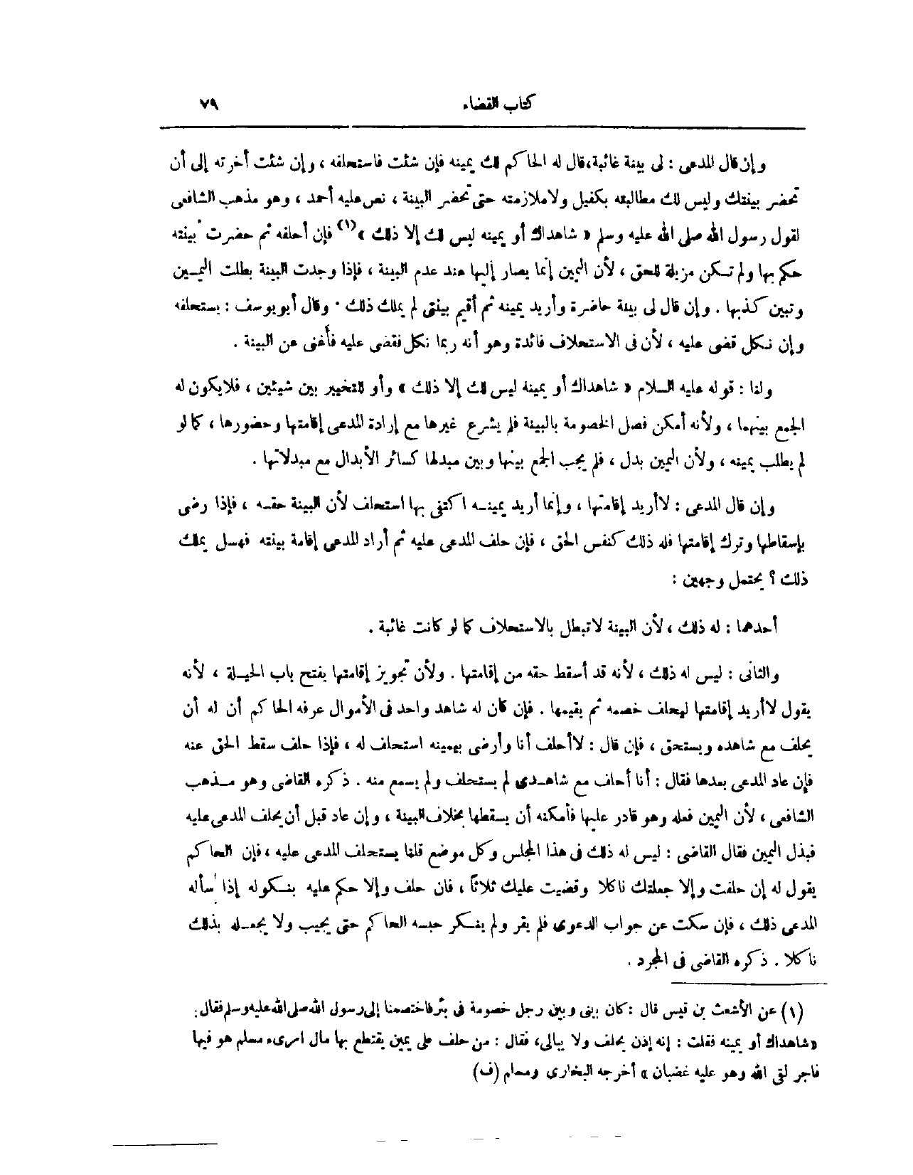 وَلَنَا، قَوْلُهُ - عَلَيْهِ السَّلَامُ -: «شَاهِدَاك أَوْ يَمِينُهُ، لَيْسَ لَك إلَّا ذَلِكَ» . وَ " أَوْ " لِلتَّخْيِيرِ بَيْنَ شَيْئَيْنِ، فَلَا يَكُونُ لَهُ الْجَمْعُ بَيْنَهُمَا، وَلِأَنَّهُ أَمْكَنَ فَصْلُ الْخُصُومَةِ بِالْبَيِّنَةِ، فَلَمْ يُشْرَعْ غَيْرُهَا مَعَ إرَادَةِ الْمُدَّعِي إقَامَتَهَا وَحُضُورَهَا، كَمَا لَوْ لَمْ يَطْلُبْ يَمِينَهُ، وَلِأَنَّ الْيَمِينَ بَدَلٌ، فَلَمْ يَجِبْ الْجَمْعُ بَيْنَهَا وَبَيْنَ مُبْدَلِهَا، كَسَائِرِ الْأَبْدَالِ مَعَ مُبْدَلَاتِهَا، وَإِنْ قَالَ الْمُدَّعِي: لَا أُرِيدُ إقَامَتَهَا، وَإِنَّمَا أُرِيدُ يَمِينَهُ أَكْتَفِي بِهَا.
