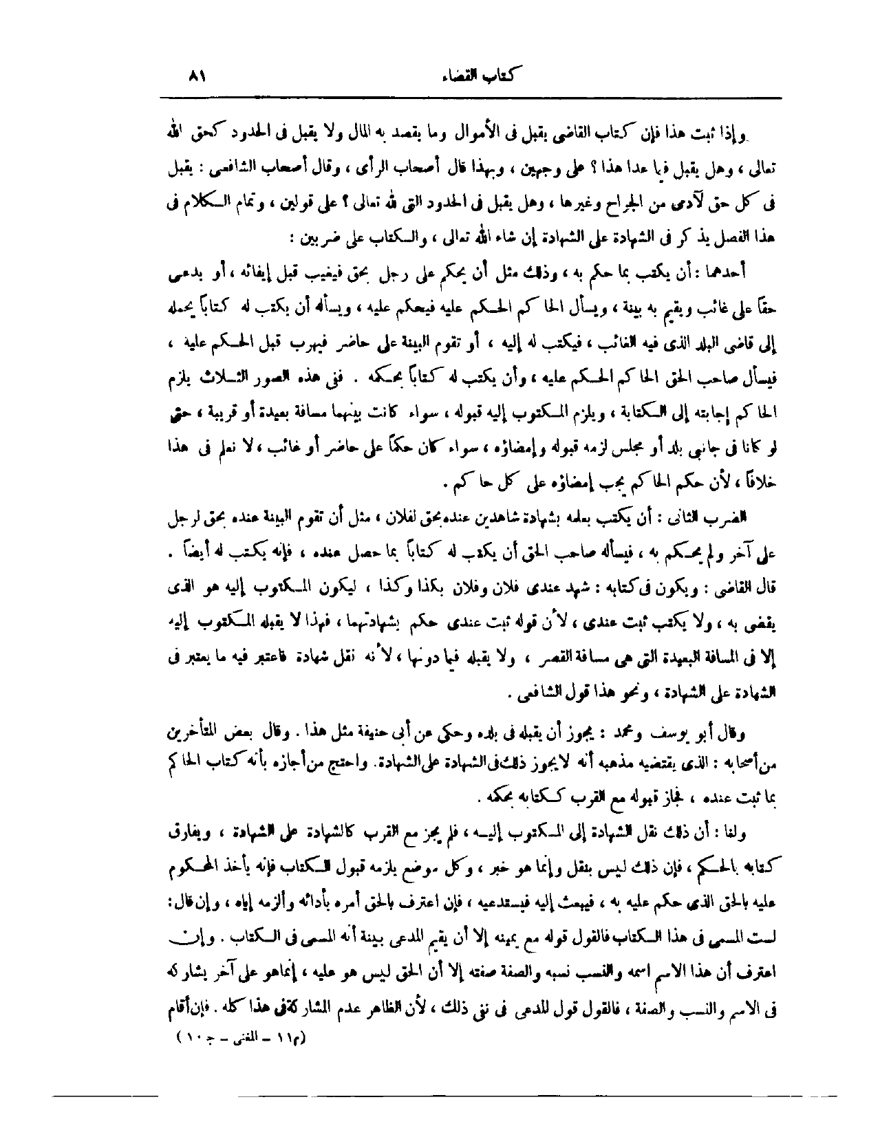 وَقَالَ أَصْحَابُ الشَّافِعِيِّ: يُقْبَلُ فِي كُلِّ حَقٍّ لِآدَمِيٍّ، مِنْ الْجِرَاحِ وَغَيْرِهَا، وَهَلْ يُقْبَلُ فِي الْحُدُودِ الَّتِي لِلَّهِ تَعَالَى؟ عَلَى قَوْلَيْنِ. وَتَمَامُ الْكَلَامِ فِي هَذَا الْفَصْلِ يُذْكَرُ فِي الشَّهَادَةِ عَلَى الشَّهَادَةِ، إنْ شَاءَ اللَّهُ تَعَالَى. وَالْكِتَابُ عَلَى ضَرْبَيْنِ؛ أَحَدُهُمَا، أَنْ يَكْتُبَ بِمَا حَكَمَ بِهِ، وَذَلِكَ مِثْلُ أَنْ يَحْكُمَ عَلَى رَجُلٍ بِحَقٍّ، فَيَغِيبَ قَبْلَ إيفَائِهِ، أَوْ يَدَّعِيَ حَقًّا عَلَى غَائِبٍ، وَيُقِيمَ بِهِ بَيِّنَةً، وَيَسْأَلَ الْحَاكِمَ الْحُكْمَ عَلَيْهِ، فَيَحْكُمَ عَلَيْهِ، وَيَسْأَلَهُ أَنْ يَكْتُبَ لَهُ كِتَابًا يَحْمِلُهُ إلَى قَاضِي الْبَلَدِ الَّذِي فِيهِ الْغَائِبُ، فَيَكْتُبَ لَهُ إلَيْهِ، أَوْ تَقُومَ الْبَيِّنَةُ عَلَى حَاضِرٍ، فَيَهْرُبَ قَبْلَ الْحُكْمِ عَلَيْهِ، فَيَسْأَلَ صَاحِبُ الْحَقِّ الْحَاكِمَ الْحُكْمَ عَلَيْهِ، وَأَنْ يَكْتُبَ لَهُ كِتَابًا بِحُكْمِهِ.