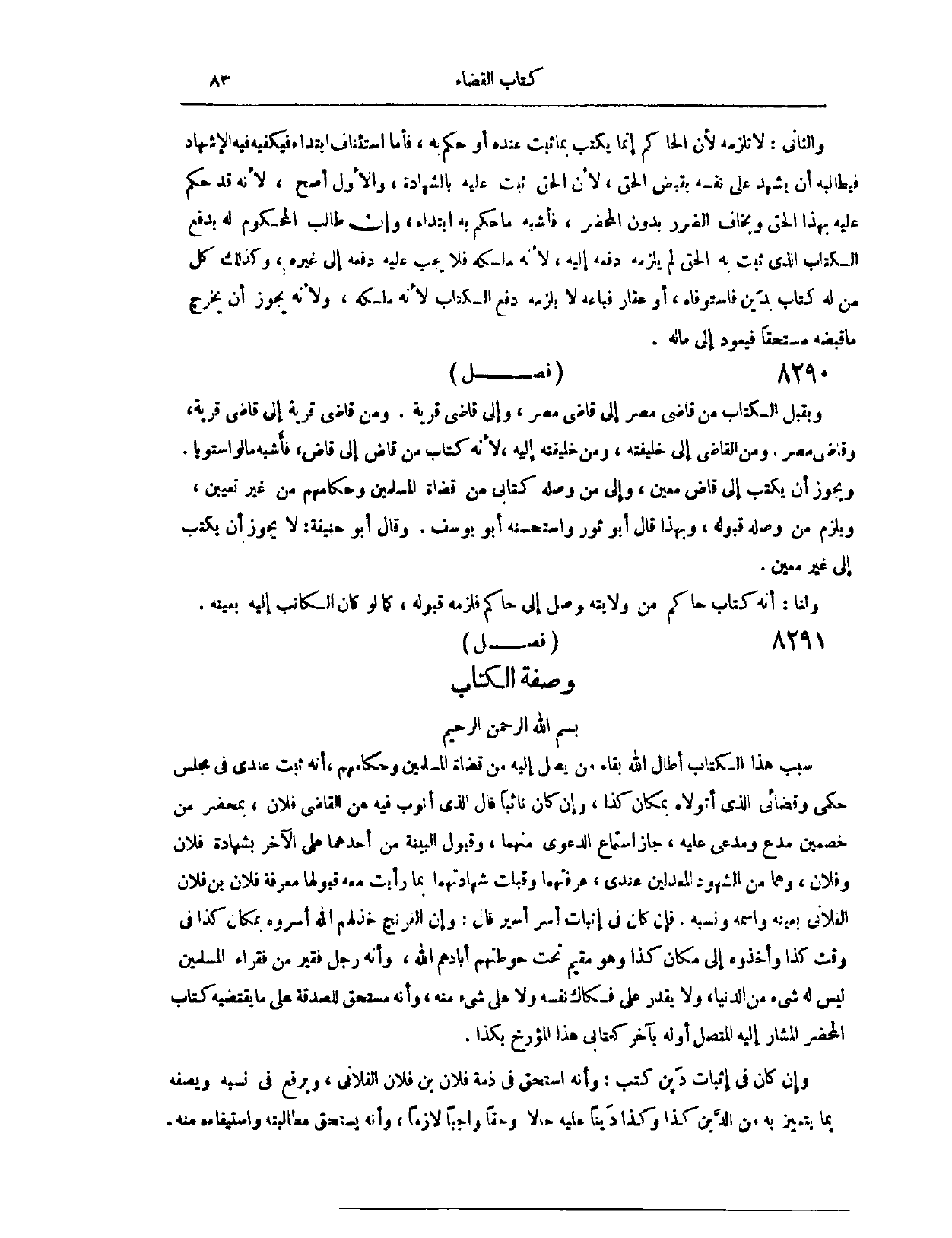 فَصْلٌ: وَصِفَةُ الْكِتَابِ: بِسْمِ اللَّهِ الرَّحْمَنِ الرَّحِيمِ سَبَبُ هَذَا الْكِتَابِ أَطَالَ اللَّهُ بَقَاءَ مَنْ يَصِلُ إلَيْهِ مِنْ قُضَاةِ الْمُسْلِمِينَ وَحُكَّامِهِمْ، أَنَّهُ ثَبَتَ عِنْدِي فِي مَجْلِسِ حُكْمِي وَقَضَائِي، الَّذِي أَتَوَلَّاهُ بِمَكَانِ كَذَا. وَإِنْ كَانَ نَائِبًا، قَالَ: الَّذِي أَنُوبُ فِيهِ عَنْ الْقَاضِي فُلَانٍ، بِمَحْضَرٍ مِنْ خَصْمَيْنِ؛ مُدَّعٍ، وَمُدَّعًى عَلَيْهِ، جَازَ اسْتِمَاعُ الدَّعْوَى مِنْهُمَا، وَقَبُولُ الْبَيِّنَةِ مِنْ أَحَدِهِمَا عَلَى الْآخَرِ، بِشَهَادَةِ فُلَانٍ وَفُلَانٍ، وَهُمَا مِنْ الشُّهُودِ الْمُعَدَّلِينَ عِنْدِي، عَرَفْتُهُمَا، وَقَبِلْت شَهَادَتَهُمَا، بِمَا رَأَيْت مَعَهُ قَبُولَهَا مَعْرِفَةَ فُلَانِ بْنِ فُلَانٍ الْفُلَانِيِّ، بِعَيْنِهِ وَاسْمِهِ وَنَسَبِهِ.