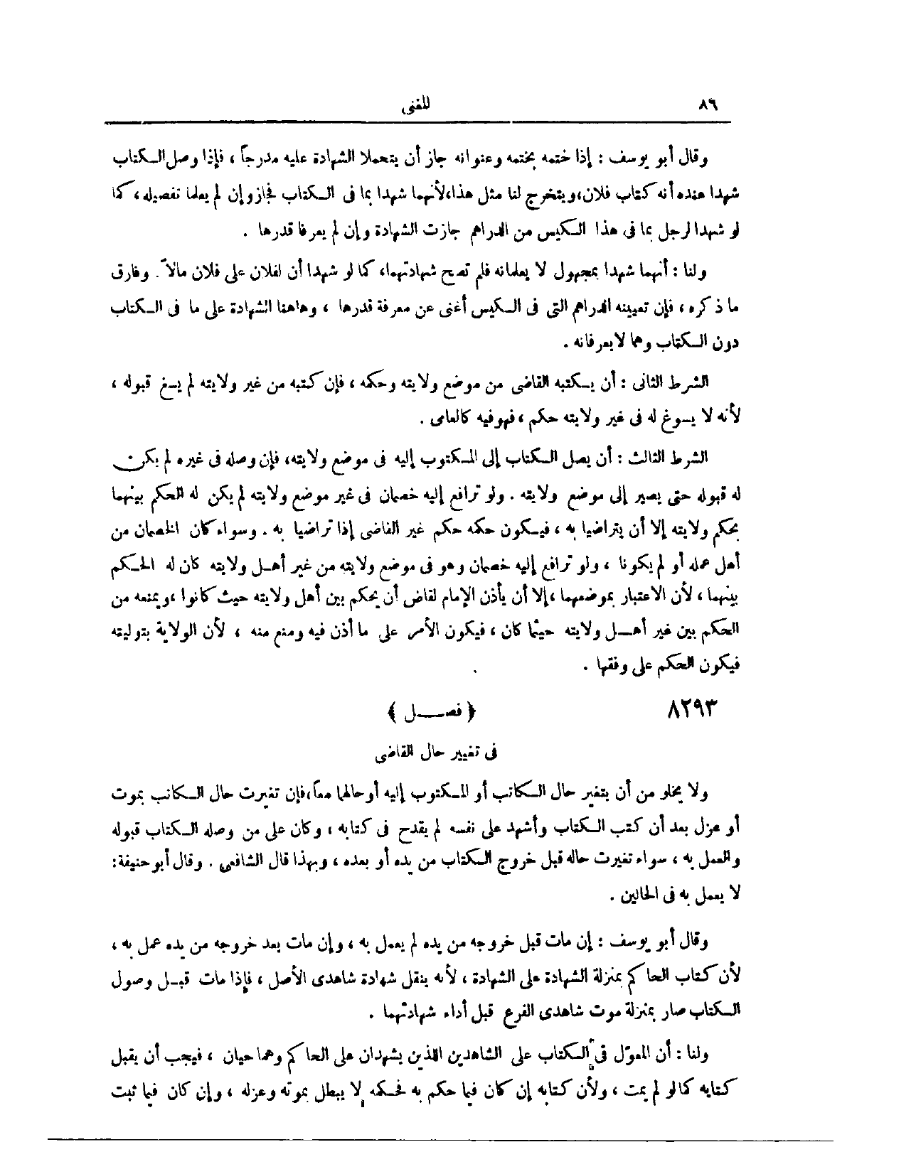 (٨٢٨٤) فَصْلٌ: فِي تَغْيِيرِ حَالِ الْقَاضِي: وَلَا يَخْلُو مِنْ أَنْ يَتَغَيَّرَ حَالُ الْكَاتِبِ أَوْ الْمَكْتُوبِ إلَيْهِ، أَوْ حَالُهُمَا مَعًا، فَإِنْ تَغَيَّرَتْ حَالُ الْكَاتِبِ، بِمَوْتٍ أَوْ عَزْلٍ، بَعْدَ أَنْ كَتَبَ الْكِتَابَ، وَأَشْهَدَ عَلَى نَفْسِهِ، لَمْ يَقْدَحْ فِي كِتَابِهِ، وَكَانَ عَلَى مَنْ وَصَلَهُ الْكِتَابُ قَبُولُهُ، وَالْعَمَلُ بِهِ، سَوَاءٌ تَغَيَّرَتْ حَالُهُ قَبْلَ خُرُوجِ الْكِتَابِ مِنْ يَدِهِ، أَوْ بَعْدَهُ. وَبِهَذَا قَالَ الشَّافِعِيُّ.