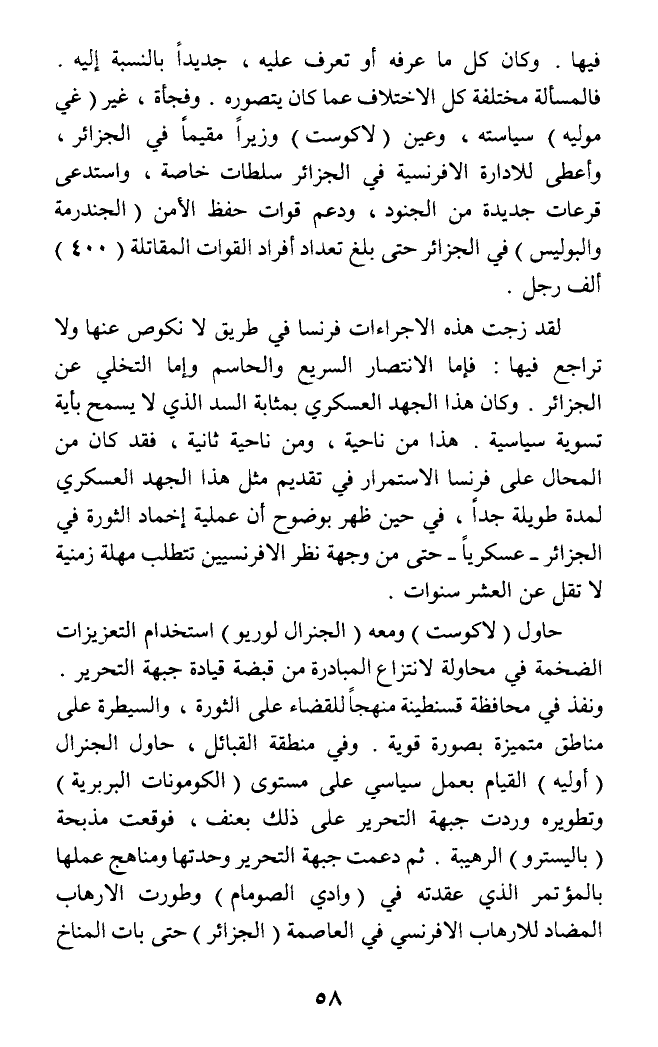 فيها. وكان كل ما عرفه أو تعرف عليه، جديدا بالنسبة إليه. فالمسألة مختلفة كل الاختلاف عما كان يتصوره. وفجأة، غير (غي موليه) سياسته، وعين (لاكوست) وزيرا مقيما في الجزائر، وأعطى للإدارة الإفرنسية في الجزائر سلطات خاصة، واستدعى قرعات جديدة من الجنود، ودعم قوات حفظ الأمن (الجندرمة والبوليس) في الجزائر حتى بلغ تعداد أفراد القوات المقاتلة (400) ألف رجل.