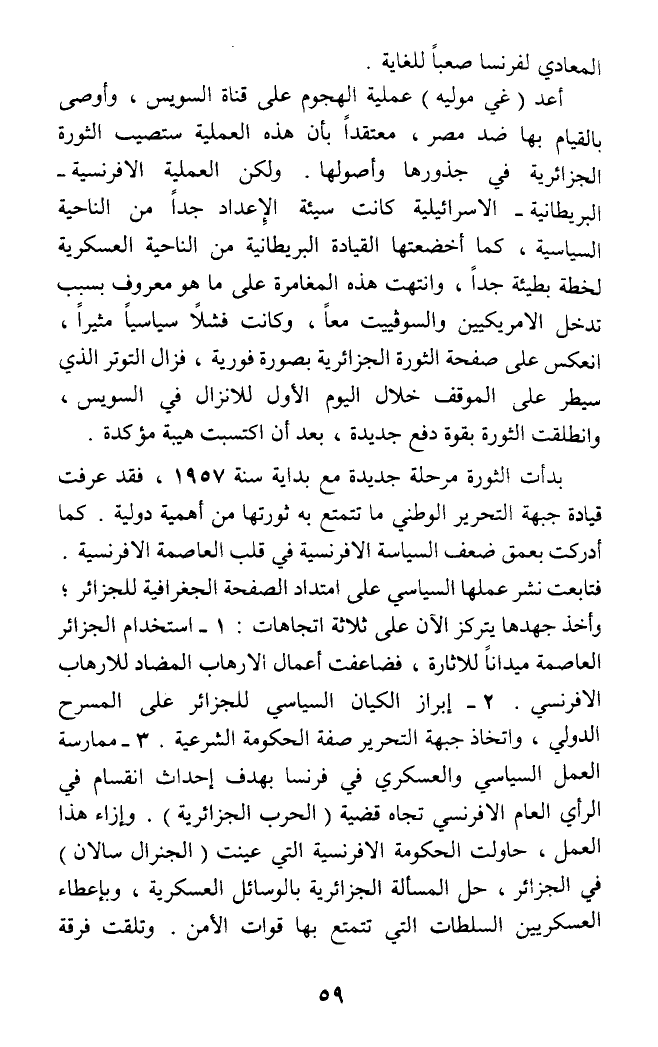 أعد (غى موليه) عملية الهجوم على قناة السويس، وأوصى بالقيام بها ضد مصر، معتقدا بأن هذه العملية ستصيب الثورة الجزائرية في جذورها وأصولها. ولكن العملية الإفرنسية - البريطانية - الإسرائيلية كانت سيئة الإعداد جدا من الناحية السياسية، كما أخضعتها القيادة البريطانية من الناحية العسكرية لخطة بطيئة جدا، وانتهت هذه المغامرة على ما هو معروف بسبب تدخل الأمريكيين والسوفييت معا، وكانت فشلا سياسيا مثيرا، انعكس على صفحة الثورة الجزائرية بصورة فورية، فزال التوتر الذي سيطر على الموقف خلال اليوم الأول للإنزال في السويس، وانطلت الثورة بقوة دفع جديدة، بعد أن اكتسبت هيبة مؤكدة.