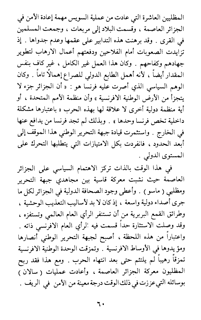 المظليين العاشرة التي عادت من عملية السويس مهمة إعادة الأمن في الجزائر العاصمة، وقسمت البلاد إلى مربعات، وجمعت المسلمين في القرى. وقد برهنت هذه التدابير على عقمها وعدم جدواها. إذ تزايدت الصعوبات أمام الفلاحين ودفعتهم أعمال الإرهاب لتطوير جهادهم وكفاحهم. وكان هذا العمل غير الكامل، غير كاف بنفس المقدار أيضا، لأنه أهمل الطابع الدولي للصراع إهمالا تاما. وكان الوهم السياسي الذي أصرت عليه فرنسا هو: (أن الجزائر جزء لا يتجزأ من الأرض الوطنية الإفرنسية) وأن منظمة الأمم المتحدة، أو أية منظمة دولية أخرى لا علاقة لها بهذه الحرب (باعتبارها مشكلة داخلية تخص فرنسا وحدها). وبذلك لم تجد فرنسا من يدافع عنها في الخارج. واستثمرت قيادة جبهة التحرير الوطني هذا الموقف إلى أبعد الحدود، فانفردت بكل الامتيازات التي يتطلبها التحرك على المستوى الدولي.