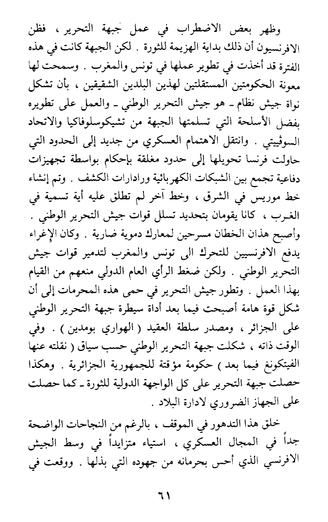 التحرير الوطني. ولكن ضغط الرأي العام الدولي منعهم من القيام بهذا العمل. وتطور جيش التحرير في حمى هذه المحرمات إلى أن شكل قوة هامة أصبحت فيما بعد أداة سيطرة جبهة التحرير الوطني على الجزائر، ومصدر سلطة العقيد (الهواري بومدين). وفي الوقت ذاته، شكلت جبهة التحرير الوطني حسب سياق (نقلته عنها الفيتكونغ فيما بعد) حكومة مؤقتة للجمهورية الجزائرية. وهكذا حصلت جبهة التحرير على كل الواجهة الدولية للثورة - كما حصلت على الجهاز الضروري لإدارة البلاد.