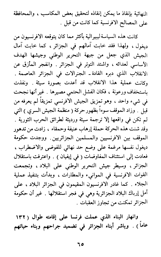 كانت هذه السياسة ليبيرالية بأكثر مما كان يتوقعه الإفرنسيون من ديغول، ولهذا فقد خابت آمالهم في الجزائر، كما خابت آمال الجيش الذي جعل من جبهة التحرير الوطني وجيشها الهدف الأساسي لعدائه، واشتد التوتر في الجزائر. وانفجر المأزق عن الانقلاب الذي دبره القادة - الجنرالات في الجزائر العاصمة. وكانت عملية هذا الانقلاب قد أعدت بصورة سيئة. ونفذت باستخفاف ورعونة، فكان الفشل الحتمي مصيرها. غير أنها نجحت في شيء واحد، وهو تمزيق الجيش الإفرنسي تمزيقا لم يعرفه من قبل. وزاد الموقف سوءا بظهور حركة (منظمة الجيش السري) التي لم تكن في واقعها إلا ترجمة سيئة ورديئة لطرائق الحرب الثورية. وقد شنت هذه الحركة حملة إرهاب عنيفة وحمقاء، زادت من تدهور الموقف بين الإفرنسيين والمسلمين الجزائريين. ووجدت حكومة ديغول نفسها مرغمة على وضع حد نهائي للفوضى والاضطراب، فعادت إلى استئناف المفاوضات (في إيفيان). واعترفت باستقلال الجزائر، وسيطر جيش التحرير الوطني على البلاد، وتجمعت القوات الإفرنسية في الموانيء والمطارات، وبدأت بتنفيذ عملية الجلاء. كما غادر الإفرنسيون المقيمون في الجزائر البلاد، على أمل إرباك البلاد الجزائرية وهي في فجر استقلالها. غير أن حكومة الجزائر تمكنت من تجاوز العقبات.