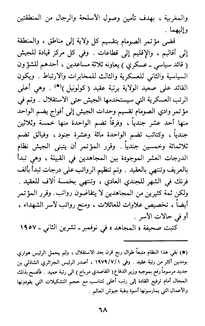 قضى مؤتمر الصومام بتقسيم كل ولاية إلى مناطق، والمنطقة إلى أقاليم، والإقليم إلى قطاعات. وفي كل مركز قيادة للجيش (قائد سياسي - عسكري) يعاونه ثلاثة مساعدين، أحدهم للشؤون السياسية والثاني للعسكرية والثالث للمخابرات والارتباط. ويكون القائد على صعيد الولاية برتبة عقيد (كولونيل) (*). وهي أعلى الرتب العسكرية التي سيستخدمها الجيش حتى الاستقلال. وتم في مؤتمر وادي الصومام تقسيم وحدات الجيش إلى أفواج يضم الواحد منها أحد عشر جنديا، وفرقا تضم الواحدة منها خمسة وثلاثين جنديا، وكتائب تضم الواحدة مائة وعشرة جنود، وفيالق تضم ثلاثمائة وخمسين جنديا. وقرر المؤتمر أن يتبنى الجيش نظام الدرجات العشر الموجودة بين المجاهدين في القبيلة، وهي تبدأ بالعريف وتنتهي بالعقيد. وتم تنظيم الرواتب على درجات تبدأ بألف فرنك في الشهر للجندي العادي، وتنتهي بخمسة آلاف للعقيد. ولكن ثمة كثيرين من المجاهدين لا يتقاضون رواتب. وقرر المؤتمر أيضا، تخصيص علاوات للعائلات، ومنح رواتب لأسر الشهداء، أو في حالات الأسر.