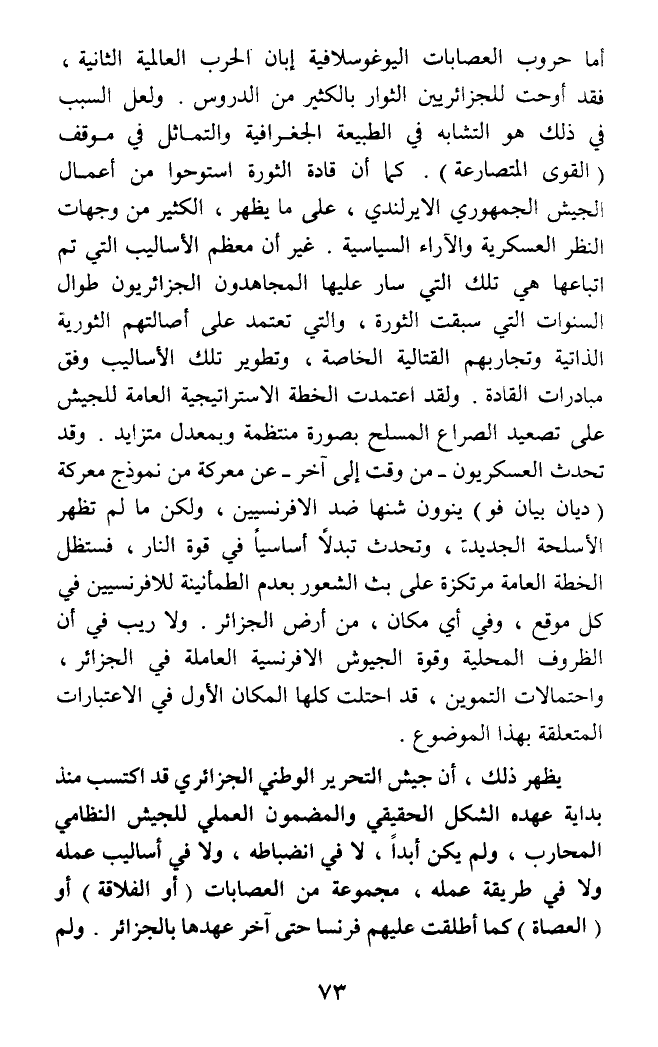 النظر العسكرية والآراء السياسة. غير أن معظم الأساليب التي تم اتباعها هي تلك التي سار عليها المجاهدون الجزائريون طوال السنوات التي سبقت الثورة، والتي تعتمد على أصالتهم الثورية الذاتية وتجاربهم القتالية الخاصة، وتطوير تلك الأساليب وفق مبادرات القادة. ولقد اعتمدت الخطة الاستراتيجية العامة للجيش على تصعيد الصراع المسلح بصورة منتظمة وبمعدل متزايد. وقد تحدث العسكريون - من وقت إلى آخر - عن معركة من نموذج معركة (ديان بيان فو) ينوون شنها ضد الإفرنسيين، ولكن ما لم تظهر الأسلحة الجديدة، وتحدث تبدلا أساسيا في قوة النار، فستظل الخطة العامة مرتكزة على بث الشعور بعدم الطمأنينة للإفرسيين في كل موقع، وفي أي مكان، من أرض الجزائر. ولا ريب في أن الظروف المحلية وقوة الجيوش الإفرنسية العاملة في الجزائر، واحتمالات التموين، قد احتكلت كلها المكان الأول في الاعتبارات المتعلقة بهذا الموضوع.