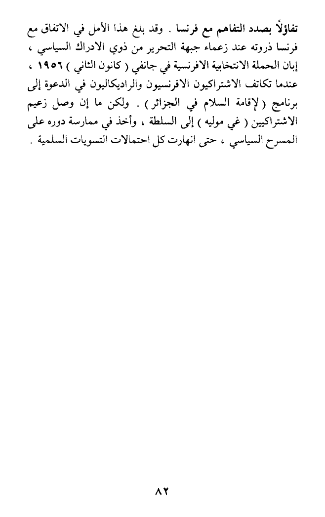 تفاؤلا بصدد التفاهم مع فرنسا. وقد بلغ هذا الأمل في الاتفاق مع فرنسا ذروته عند زعماء جبهة التحرير من ذوي الإدراك السياسي، إبان الحملة الانتخابية الإفرنسية في جانفي (كانون الثاني) 1956، عندما تكاتف الاشتراكيون الإفرنسيون والراديكاليون في الدعوة إلى برنامج (لإقامة السلام في الجزائر). ولكن ما إن وصل زعيم الاشتراكيين (غي موليه) إلى السلطة، وأخذ في ممارسة دوره على المسرح السياسي، حتى انهارت كل احتمالات التسويات السلمية