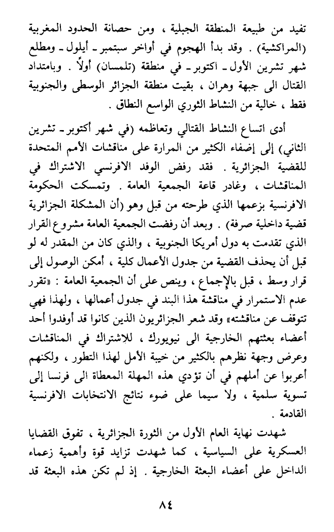 أدى اتساع النشاط القتالي وتعاظمه (في شهر أكتوبر - تشرين الثاني) إلى إضفاء الكثير من المرارة على مناقشات الأمم المتحدة للقضية الجزائرية. فقد رفض الوفد الإفرنسي الاشتراك في المناقشات، وغادر قاعة الجمعية العامة. وتمسكت الحكومة الإفرنسية بزعمها الذي طرحته من قبل وهو (أن المشكلة الجزائرية قضية داخلية صرفة). وبعد أن رفضت الجمعية العامة مشروع القرار الذي تقدمت به دول أمريكا الجنوبية، والذي كان من المقدر له لو قبل أن يحذف القضية من جدول الأعمال كلية، أمكن الوصول إلى قرار وسط، قبل بالإجماع، وينص على أن الجمعية العامة: (تقرر عدم الاستمرار في مناقشة هذا البند في جدول أعمالها، ولهذا فهي تتوقف عن مناقشته) وقد شعر الجزائريون الذين كانوا قد أوفدوا أحد أعضاء بعثتهم الخارجية الى نيويورك، للاشتراك في المناقشات وعرض وجهة نظرهم بالكثير من خيبة الأمل لهذا التطور، ولكنهم أعربوا عن أملهم في أن تؤدي هذه المهلة المعطاة الى فرنسا إلى تسوية سلمية، ولا سيما على ضوء نتائج الانتخابات الإفرنسية القادمة.