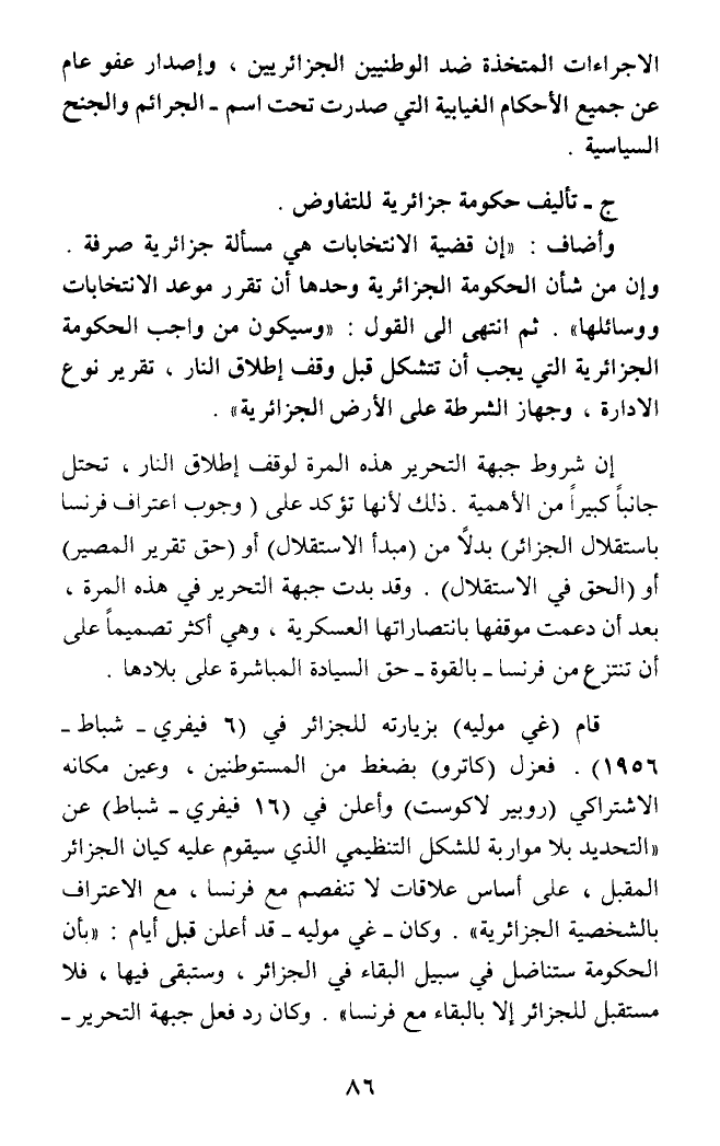 وأضاف: (إن قضية الانتخابات هي مسألة جزائرية صرفة. وإن من شأن الحكومة الجزائرية وحدها أن تقرر موعد الانتخابات ووسائلها). ثم انتهى الى القول: (وسيكون من واجب الحكومة الجزائرية التي يجب أن تتشكل قبل وقف إطلاق النار، تقرير نوع الادارة، وجهاز الشرطة على الأرض الجزائرية).