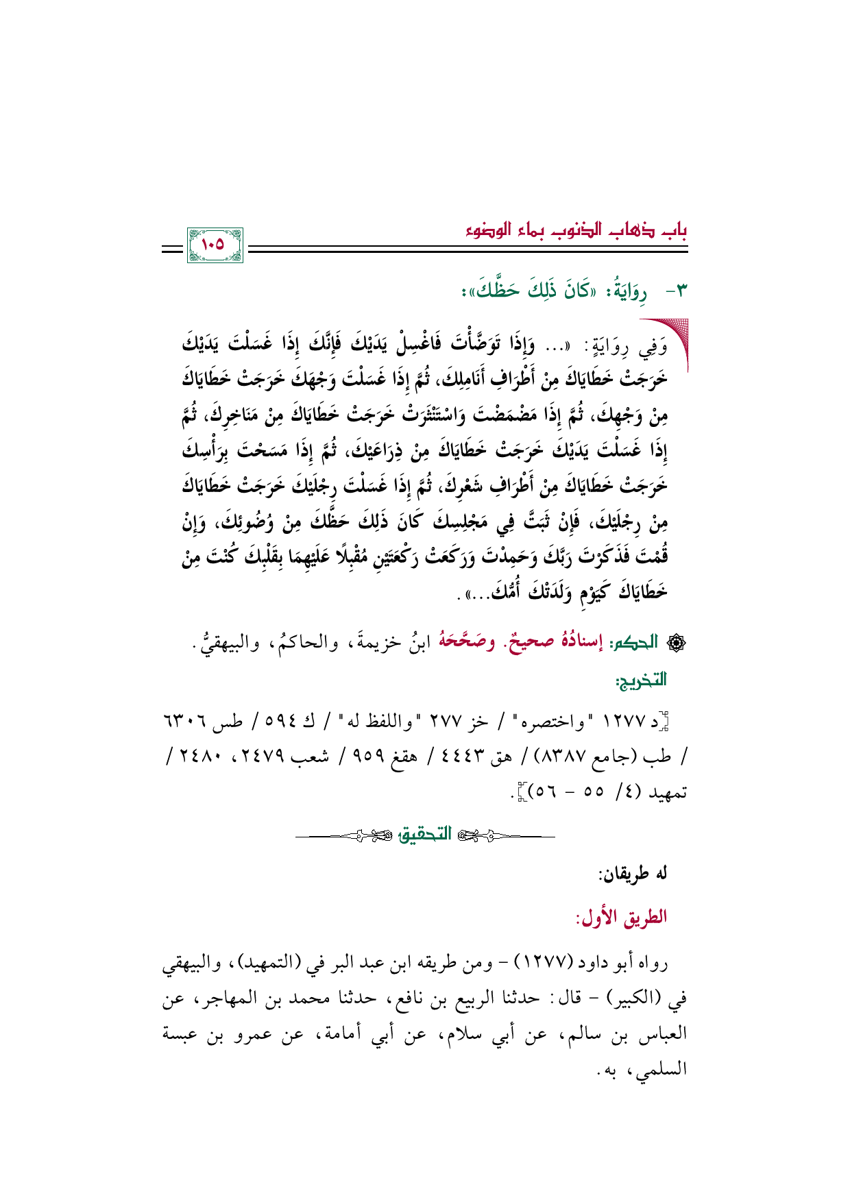 • وَفِي رِوَايَةٍ: « ... وَإِذَا تَوَضَّأْتَ فَاغْسِلْ يَدَيْكَ فَإِنَّكَ إِذَا غَسَلْتَ يَدَيْكَ خَرَجَتْ خَطَايَاكَ مِنْ أَطْرَافِ أَنَامِلِكَ، ثُمَّ إِذَا غَسَلْتَ وَجْهَكَ خَرَجَتْ خَطَايَاكَ مِنْ وَجْهِكَ، ثُمَّ إِذَا مَضْمَضْتَ وَاسْتَنْثَرَتْ خَرَجَتْ خَطَايَاكَ مِنْ مَنَاخِرِكَ، ثُمَّ إِذَا غَسَلْتَ يَدَيْكَ خَرَجَتْ خَطَايَاكَ مِنْ ذِرَاعَيْكَ، ثُمَّ إِذَا مَسَحْتَ بِرَأْسِكَ خَرَجَتْ خَطَايَاكَ مِنْ أَطْرَافِ شَعْرِكَ، ثُمَّ إِذَا غَسَلْتَ رِجْلَيْكَ خَرَجَتْ خَطَايَاكَ مِنْ رِجْلَيْكَ، فَإِنْ ثَبَتَّ فِي مَجْلِسِكَ كَانَ ذَلِكَ حَظَّكَ مِنْ وُضُوئِكَ، وَإِنْ قُمْتَ فَذَكَرْتَ رَبَّكَ وَحَمِدْتَ وَرَكَعَتْ رَكْعَتَيْنِ مُقْبِلًا عَلَيْهِمَا بِقَلْبِكَ كُنْتَ مِنْ خَطَايَاكَ كَيَوْمِ وَلَدَتْكَ أُمُّكَ ... ».
