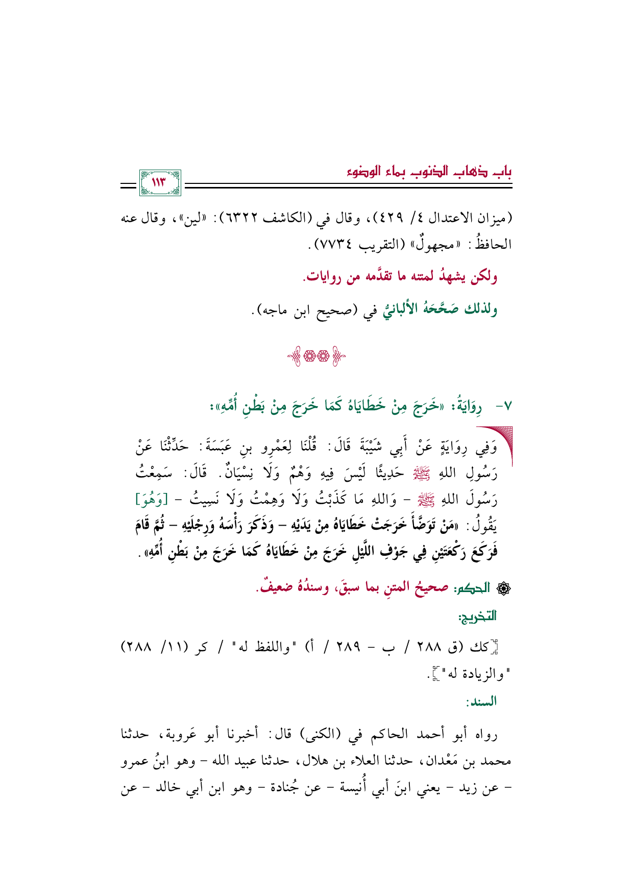• وَفِي رِوَايَةٍ عَنْ أَبِي شَيْبَةَ قَالَ: قُلْنَا لِعَمْرِو بنِ عَبَسَةَ: حَدِّثْنَا عَنْ رَسُولِ اللهِ صلى الله عليه وسلم حَدِيثًا لَيْسَ فِيهِ وَهْمٌ وَلَا نِسْيَانٌ. قَالَ: سَمِعْتُ رَسُولَ اللهِ صلى الله عليه وسلم -وَاللهِ مَا كَذَبْتُ وَلَا وَهِمْتُ وَلَا نَسِيتُ-[وَهُوَ] يَقُولُ: «مَنْ تَوَضَّأَ خَرَجَتْ خَطَايَاهُ مِنْ يَدَيْهِ -وَذَكَرَ رَأْسَهُ وَرِجْلَيْهِ- ثُمَّ قَامَ فَرَكَعَ رَكْعَتَيْنِ فِي جَوْفِ اللَّيْلِ خَرَجَ مِنْ خَطَايَاهُ كَمَا خَرَجَ مِنْ بَطْنِ أُمِّهِ».