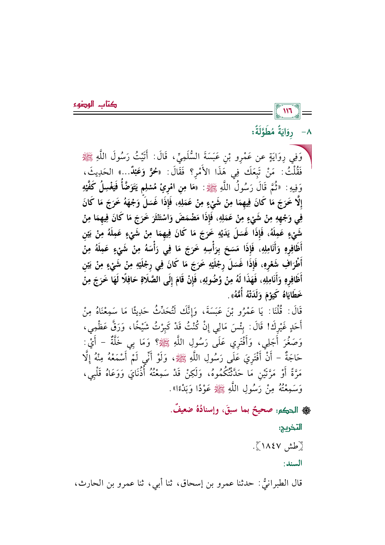 • وَفِي رِوَايَةٍ عن عَمْرِو بْنِ عَبَسَةَ السُّلَمِيِّ، قَالَ: أَتَيْتُ رَسُولَ اللَّهِ صلى الله عليه وسلم فَقُلْتُ: مَنْ تَبِعَكَ فِي هَذَا الأَمْرِ؟ فَقَالَ: «حُرٌّ وَعَبْدٌ ... » الحَدِيثَ، وَفِيهِ: "ثُمَّ قَالَ رَسُولُ اللَّهِ صلى الله عليه وسلم: «مَا مِنِ امْرِئٍ مُسْلِمٍ يَتَوَضَّأُ فَيَغْسِلُ كَفَّيْهِ إِلَّا خَرَجَ مَا كَانَ فِيهِمَا مِنْ شَيْءٍ مِنْ عَمَلِهِ، فَإِذَا غَسَلَ وَجْهَهُ خَرَجَ مَا كَانَ فِي وَجْهِهِ مِنْ شَيْءٍ مِنْ عَمَلِهِ، فَإِذَا مَضْمَضَ وَاسْتَنْثَرَ خَرَجَ مَا كَانَ فِيهِمَا مِنْ شَيْءٍ عَمِلَهُ، فَإِذَا غَسَلَ يَدَيْهِ خَرَجَ مَا كَانَ فِيهِمَا مِنْ شَيْءٍ عَمِلَهُ مِنْ بَيْنِ أَظَافِرِهِ وَأَنَامِلِهِ، فَإِذَا مَسَحَ بِرَأْسِهِ خَرَجَ مَا فِي رَأْسَهُ مِنْ شَيْءٍ عَمِلَهُ مِنْ أَطْرَافِ شَعْرِهِ، فَإِذَا غَسَلَ رِجْلَيْهِ خَرَجَ مَا كَانَ فِي رِجْلَيْهِ مِنْ شَيْءٍ مِنْ بَيْنِ أَظَافِرِهِ وَأَنَامِلِهِ، فَهَذَا لَهُ مِنْ وُضُوئِهِ، فَإِنْ قَامَ إِلَى الصَّلَاةِ حَافِلًا لَهَا خَرَجَ مِنْ خَطَايَاهُ كَيَوْمَ وَلَدَتْهُ أُمُّهُ».