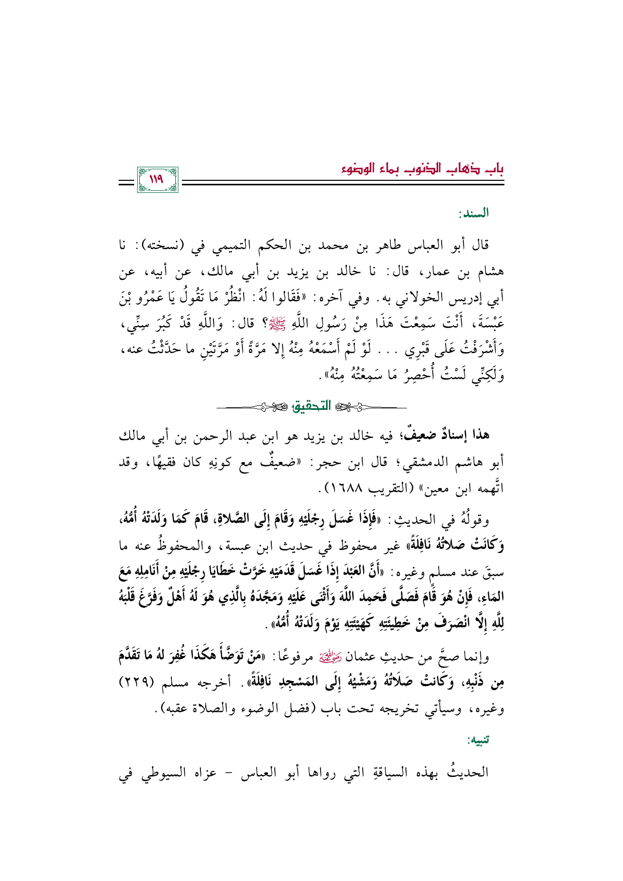 وقولُهُ في الحديثِ: «فَإِذَا غَسَلَ رِجْلَيْهِ وَقَامَ إِلَى الصَّلاةِ، قَامَ كَمَا وَلَدَتْهُ أُمُّهُ، وَكَانَتْ صَلاتُهُ نَافِلَةً» غير محفوظ في حديث ابن عبسة، والمحفوظُ عنه ما سبقَ عند مسلمٍ وغيره: «أَنَّ العَبْدَ إِذَا غَسَلَ قَدَمَيْهِ خَرَّتْ خَطَايَا رِجْلَيْهِ مِنْ أَنَامِلِهِ مَعَ المَاءِ، فَإِنْ هُوَ قَامَ فَصَلَّى فَحَمِدَ اللَّهَ وَأَثْنَى عَلَيْهِ وَمَجَّدَهُ بِالَّذِي هُوَ لَهُ أَهْلٌ وَفَرَّغَ قَلْبَهُ لِلَّهِ إِلَّا انْصَرَفَ مِنْ خَطِيئَتِهِ كَهَيْئَتِهِ يَوْمَ وَلَدَتْهُ أُمُّهُ».