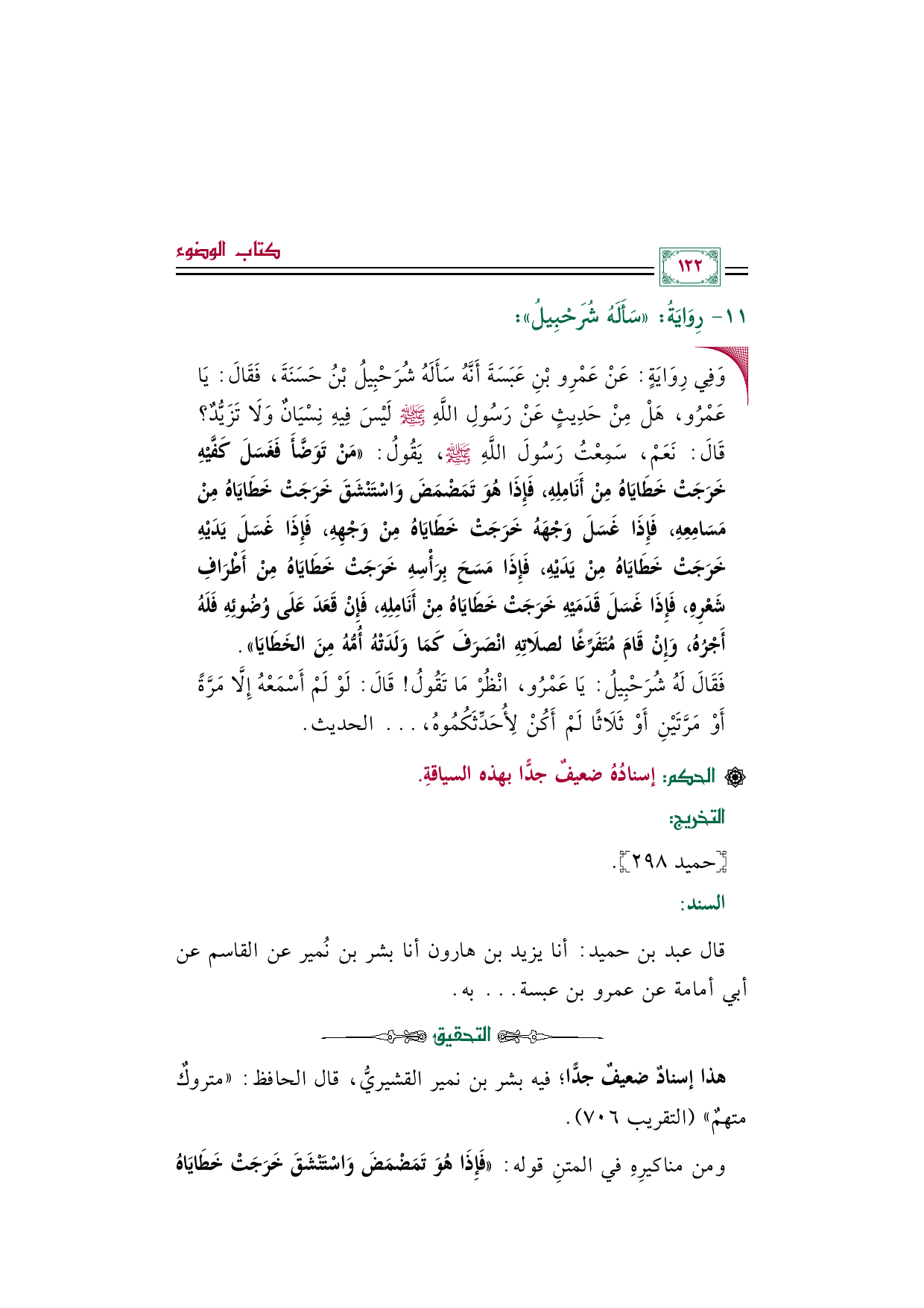 • وَفِي رِوَايَةٍ: عَنْ عَمْرِو بْنِ عَبَسَةَ أَنَّهُ سَأَلَهُ شُرَحْبِيلُ بْنُ حَسَنَةَ، فَقَالَ: يَا عَمْرُو، هَلْ مِنْ حَدِيثٍ عَنْ رَسُولِ اللَّهِ صلى الله عليه وسلم لَيْسَ فِيهِ نِسْيَانٌ وَلَا تَزَيُّدٌ؟ قَالَ: نَعَمْ، سَمِعْتُ رَسُولَ اللَّهِ صلى الله عليه وسلم، يَقُولُ: «مَنْ تَوَضَّأَ فَغَسَلَ كَفَّيْهِ خَرَجَتْ خَطَايَاهُ مِنْ أَنَامِلِهِ، فَإِذَا هُوَ تَمَضْمَضَ وَاسْتَنْشَقَ خَرَجَتْ خَطَايَاهُ مِنْ مَسَامِعِهِ، فَإِذَا غَسَلَ وَجْهَهُ خَرَجَتْ خَطَايَاهُ مِنْ وَجْهِهِ، فَإِذَا غَسَلَ يَدَيْهِ خَرَجَتْ خَطَايَاهُ مِنْ يَدَيْهِ، فَإِذَا مَسَحَ بِرَأْسِهِ خَرَجَتْ خَطَايَاهُ مِنْ أَطْرَافِ شَعْرِهِ، فَإِذَا غَسَلَ قَدَمَيْهِ خَرَجَتْ خَطَايَاهُ مِنْ أَنَامِلِهِ، فَإِنْ قَعَدَ عَلَى وُضُوئِهِ فَلَهُ أَجْرُهُ، وَإِنْ قَامَ مُتَفَرِّغًا لصلَاتِهِ انْصَرَفَ كَمَا وَلَدَتْهُ أُمُّهُ مِنَ الخَطَايَا».