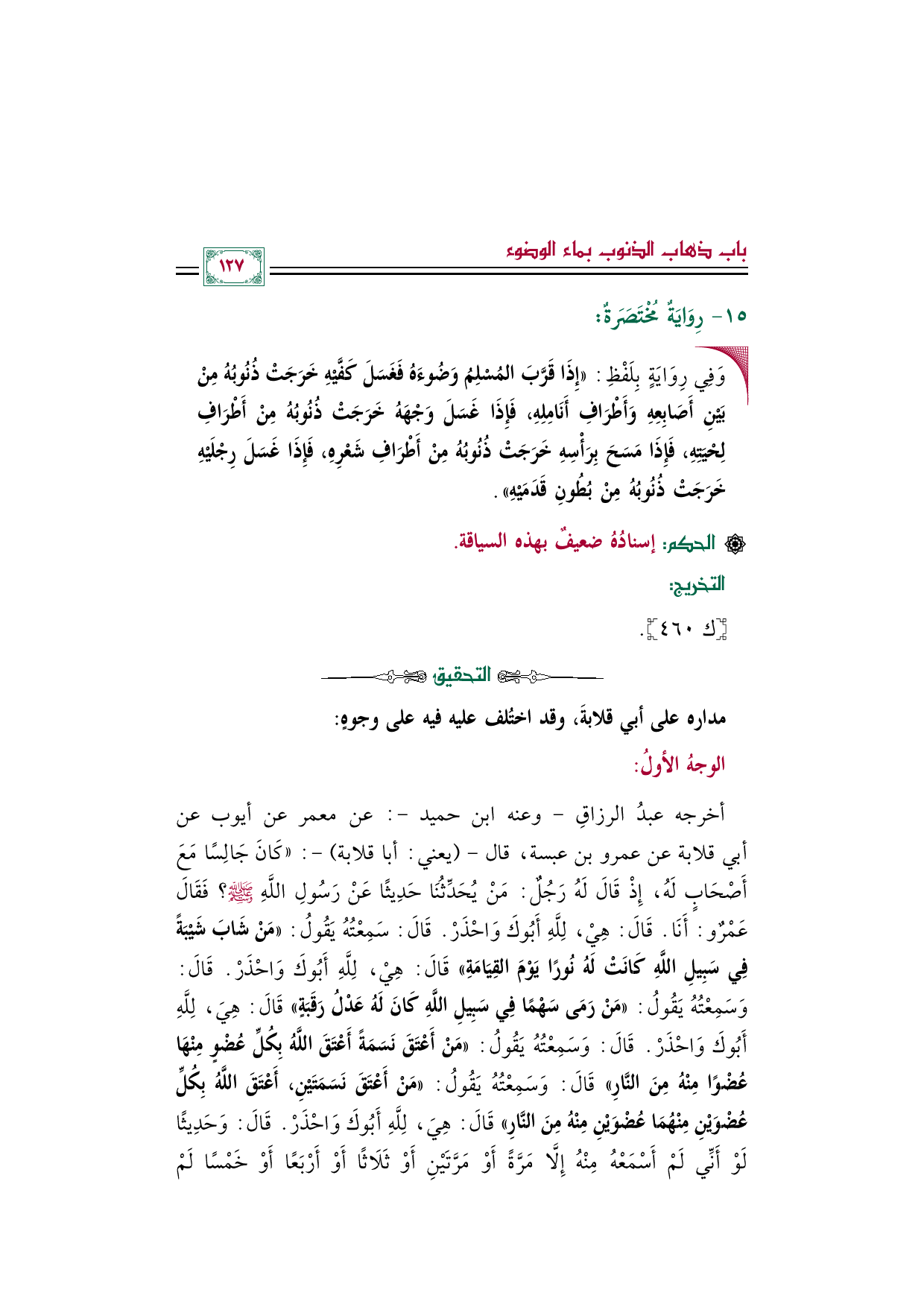 أخرجه عبدُ الرزاقِ -وعنه ابن حميد-: عن معمر عن أيوب عن أبي قلابة عن عمرو بن عبسة، قال - (يعني: أبا قلابة) -: "كَانَ جَالِسًا مَعَ أَصْحَابٍ لَهُ، إِذْ قَالَ لَهُ رَجُلٌ: مَنْ يُحَدِّثُنَا حَدِيثًا عَنْ رَسُولِ اللَّهِ صلى الله عليه وسلم؟ فَقَالَ عَمْرٌو: أَنَا. قَالَ: هِيْ، لِلَّهِ أَبُوكَ وَاحْذَرْ. قَالَ: سَمِعْتُهُ يَقُولُ: «مَنْ شَابَ شَيْبَةً فِي سَبِيلِ اللَّهِ كَانَتْ لَهُ نُورًا يَوْمَ القِيَامَةِ» قَالَ: هِيْ، لِلَّهِ أَبُوكَ وَاحْذَرْ. قَالَ: وَسَمِعْتُهُ يَقُولُ: «مَنْ رَمَى سَهْمًا فِي سَبِيلِ اللَّهِ كَانَ لَهُ عَدْلُ رَقَبَةٍ» قَالَ: هِيَ، لِلَّهِ أَبُوكَ وَاحْذَرْ. قَالَ: وَسَمِعْتُهُ يَقُولُ: «مَنْ أَعْتَقَ نَسَمَةً أَعْتَقَ اللَّهُ بِكُلِّ عُضْوٍ مِنْهَا عُضْوًا مِنْهُ مِنَ النَّارِ» قَالَ: وَسَمِعْتُهُ يَقُولُ: «مَنْ أَعْتَقَ نَسَمَتَيْنِ، أَعْتَقَ اللَّهُ بِكُلِّ عُضْوَيْنِ مِنْهُمَا عُضْوَيْنِ مِنْهُ مِنَ النَّارِ» قَالَ: هِيَ، لِلَّهِ أَبُوكَ وَاحْذَرْ. قَالَ: وَحَدِيثًا لَوْ أَنِّي لَمْ أَسْمَعْهُ مِنْهُ إِلَّا مَرَّةً أَوْ مَرَّتَيْنِ أَوْ ثَلَاثًا أَوْ أَرْبَعًا أَوْ خَمْسًا لَمْ
