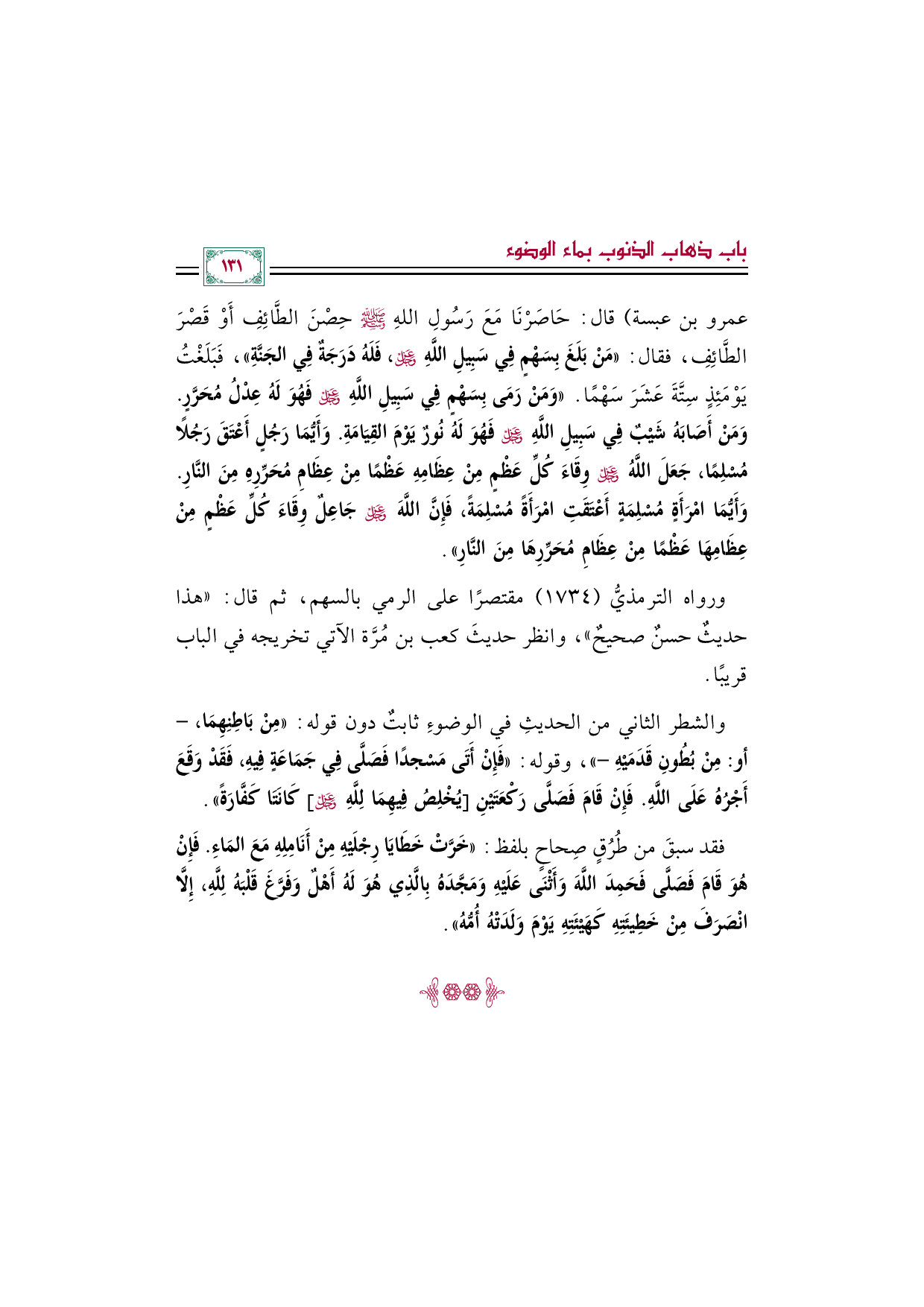 عمرو بن عبسة) قال: حَاصَرْنَا مَعَ رَسُولِ اللهِ صلى الله عليه وسلم حِصْنَ الطَّائِفِ أَوْ قَصْرَ الطَّائِفِ، فقال: «مَنْ بَلَغَ بِسَهْمٍ فِي سَبِيلِ اللَّهِ عَزَّ وَجَلَّ، فَلَهُ دَرَجَةٌ فِي الجَنَّةِ»، فَبَلَغْتُ يَوْمَئِذٍ سِتَّةَ عَشَرَ سَهْمًا. «وَمَنْ رَمَى بِسَهْمٍ فِي سَبِيلِ اللَّهِ عَزَّ وَجَلَّ فَهُوَ لَهُ عِدْلُ مُحَرَّرٍ. وَمَنْ أَصَابَهُ شَيْبٌ فِي سَبِيلِ اللَّهِ عَزَّ وَجَلَّ فَهُوَ لَهُ نُورٌ يَوْمَ القِيَامَةِ. وَأَيُّمَا رَجُلٍ أَعْتَقَ رَجُلًا مُسْلِمًا، جَعَلَ اللَّهُ عَزَّ وَجَلَّ وِقَاءَ كُلِّ عَظْمٍ مِنْ عِظَامِهِ عَظْمًا مِنْ عِظَامِ مُحَرِّرِهِ مِنَ النَّارِ. وَأَيُّمَا امْرَأَةٍ مُسْلِمَةٍ أَعْتَقَتِ امْرَأَةً مُسْلِمَةً، فَإِنَّ اللَّهَ عَزَّ وَجَلَّ جَاعِلٌ وِقَاءَ كُلِّ عَظْمٍ مِنْ عِظَامِهَا عَظْمًا مِنْ عِظَامِ مُحَرِّرِهَا مِنَ النَّارِ».