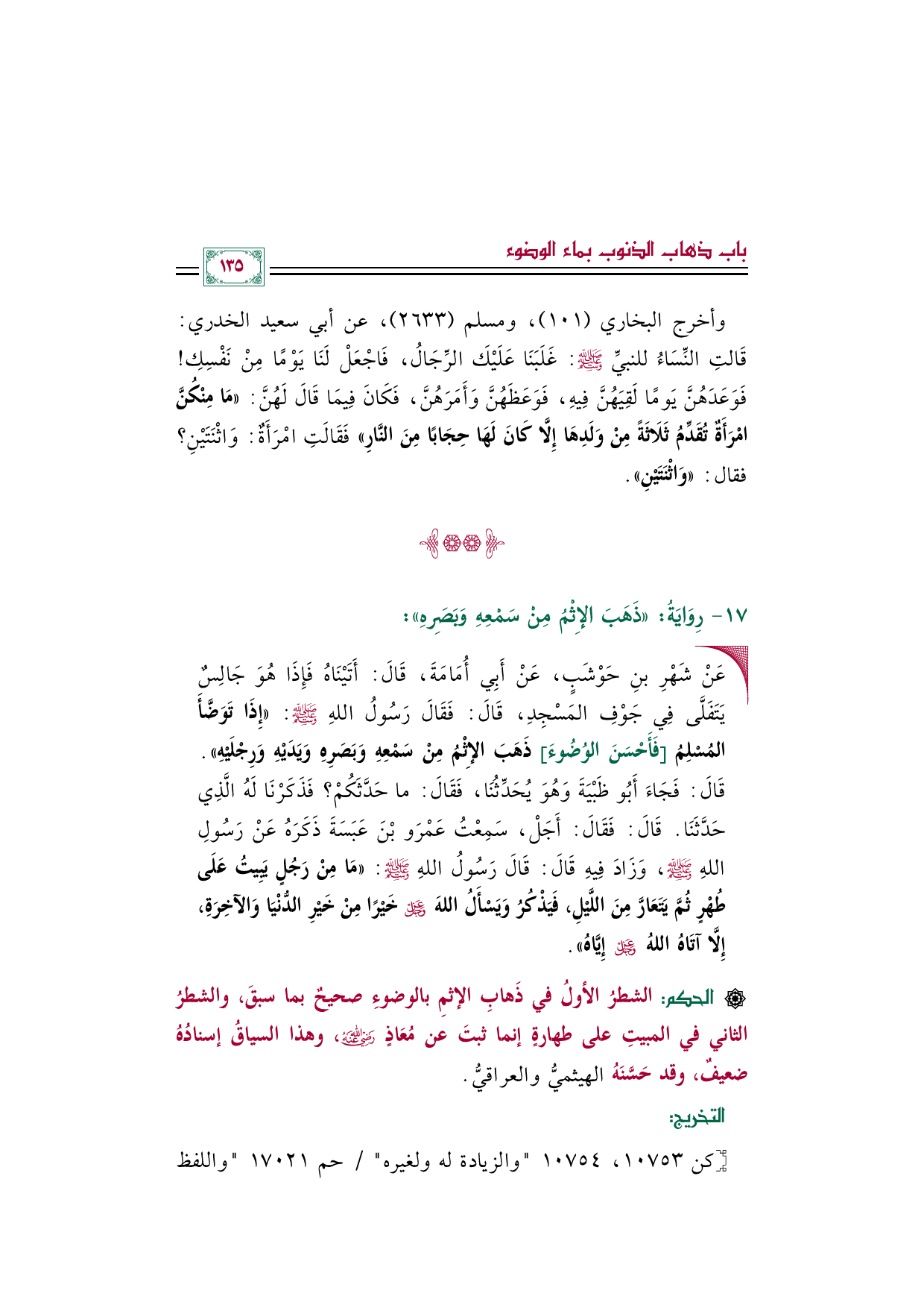 • عَنْ شَهْرِ بنِ حَوْشَبٍ، عَنْ أَبِي أُمَامَةَ، قَالَ: أَتَيْنَاهُ فَإِذَا هُوَ جَالِسٌ يَتَفَلَّى فِي جَوْفِ المَسْجِدِ، قَالَ: فَقَالَ رَسُولُ اللهِ صلى الله عليه وسلم: «إِذَا تَوَضَّأَ المُسْلِمُ [فَأَحْسَنَ الوُضُوءَ] ذَهَبَ الإِثْمُ مِنْ سَمْعِهِ وَبَصَرِهِ وَيَدَيْهِ وَرِجْلَيْهِ». قَالَ: فَجَاءَ أَبُو ظَبْيَةَ وَهُوَ يُحَدِّثُنَا، فَقَالَ: ما حَدَّثَكُمْ؟ فَذَكَرْنَا لَهُ الَّذِي حَدَّثَنَا. قَالَ: فَقَالَ: أَجَلْ، سَمِعْتُ عَمْرَو بْنَ عَبَسَةَ ذَكَرَهُ عَنْ رَسُولِ اللهِ صلى الله عليه وسلم، وَزَادَ فِيهِ قَالَ: قَالَ رَسُولُ اللهِ صلى الله عليه وسلم: «مَا مِنْ رَجُلٍ يَبِيتُ عَلَى طُهْرٍ ثُمَّ يَتَعَارَّ مِنَ اللَّيْلِ، فَيَذْكُرُ وَيَسْأَلُ اللهَ عَزَّ وَجَلَّ خَيْرًا مِنْ خَيْرِ الدُّنْيَا وَالآخِرَةِ، إِلَّا آتَاهُ اللهُ عَزَّ وَجَلَّ إِيَّاهُ».