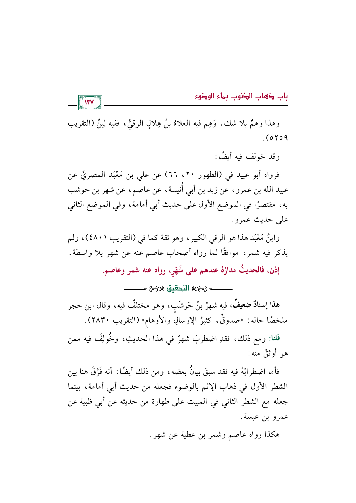 فرواه أبو عبيد في (الطهور ٢٠، ٦٦) عن علي بن مَعْبَد المصريِّ عن عبيد الله بن عمرو، عن زيد بن أبي أُنيسة، عن عاصم، عن شهر بن حوشب به، مقتصرًا في الموضع الأول على حديث أبي أمامة، وفي الموضع الثاني على حديث عمرو.