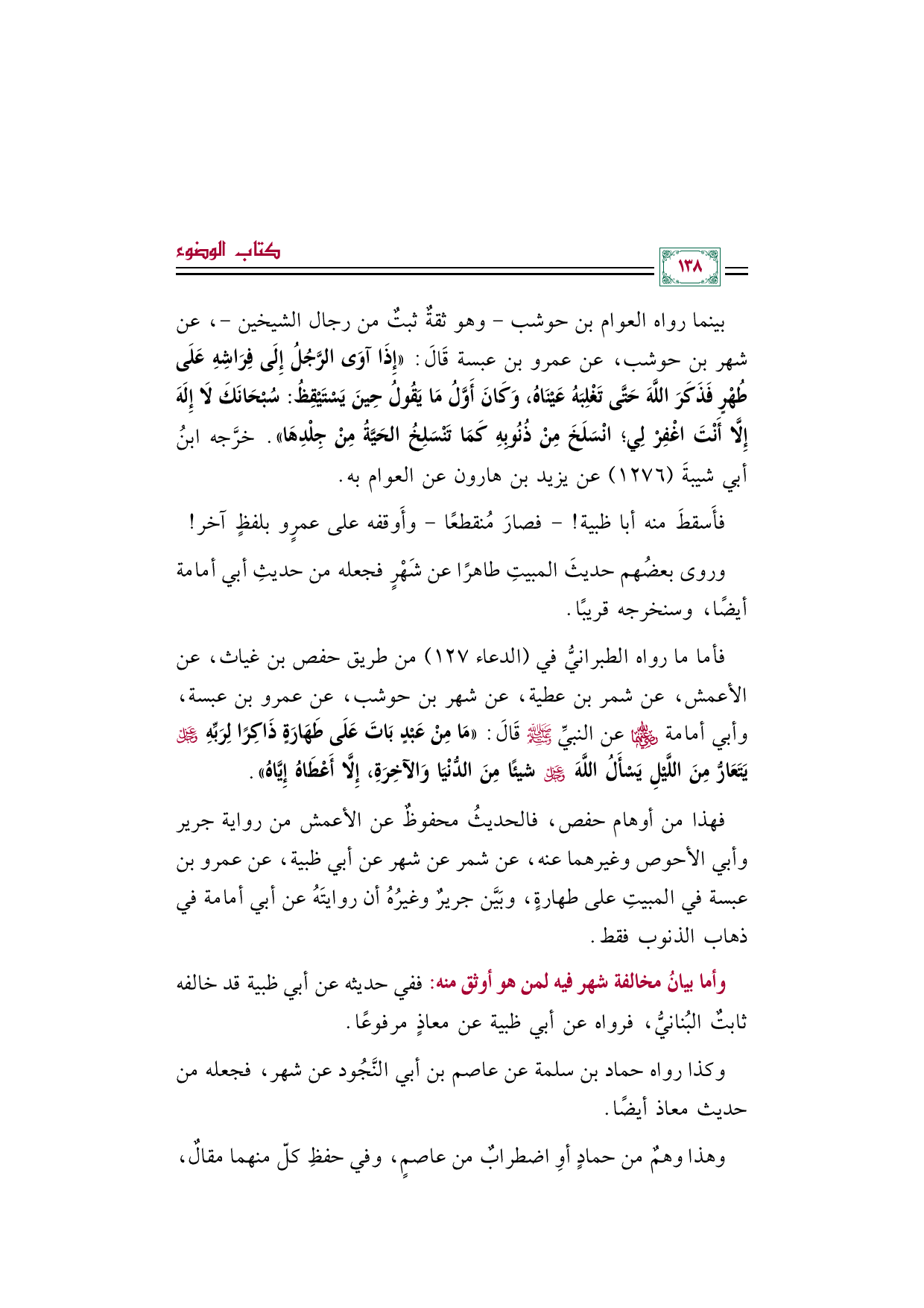 بينما رواه العوام بن حوشب -وهو ثقةٌ ثبتٌ من رجال الشيخين-، عن شهر بن حوشب، عن عمرو بن عبسة قَالَ: «إِذَا آوَى الرَّجُلُ إِلَى فِرَاشِهِ عَلَى طُهْرٍ فَذَكَرَ اللَّهَ حَتَّى تَغْلِبَهُ عَيْنَاهُ، وَكَانَ أَوَّلُ مَا يَقُولُ حِينَ يَسْتَيْقِظُ: سُبْحَانَكَ لَا إِلَهَ إِلَّا أَنْتَ اغْفِرْ لِي؛ انْسَلَخَ مِنْ ذُنُوبِهِ كَمَا تَنْسَلِخُ الحَيَّةُ مِنْ جِلْدِهَا». خرَّجه ابنُ أبي شيبةَ (١٢٧٦) عن يزيد بن هارون عن العوام به.