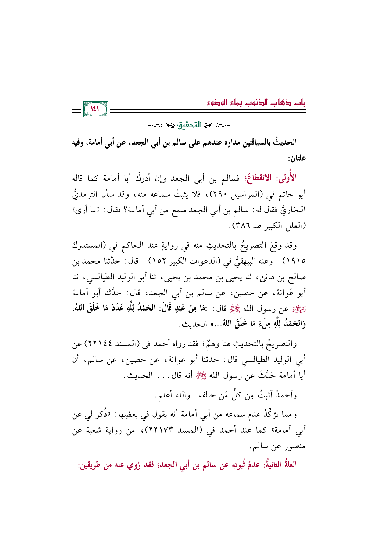 الأُولى: الانقطاعُ؛ فسالم بن أبي الجعد وإن أدركَ أبا أمامة كما قاله أبو حاتم في (المراسيل ٢٩٠)، فلا يثبتُ سماعه منه، وقد سأل الترمذيُّ البخاريَّ فقال له: سالم بن أبي الجعد سمع من أبي أمامة؟ فقال: "ما أرى" (العلل الكبير صـ ٣٨٦).