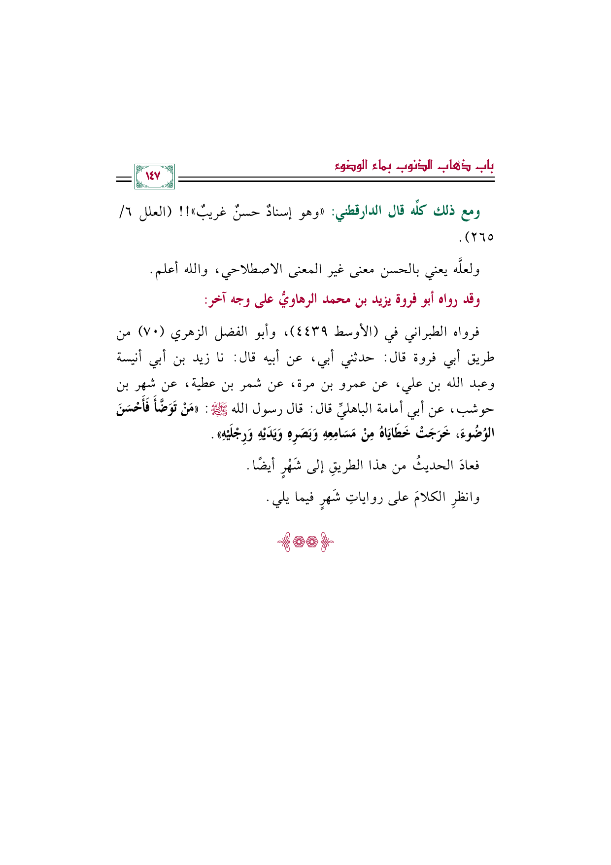 فرواه الطبراني في (الأوسط ٤٤٣٩)، وأبو الفضل الزهري (٧٠) من طريق أبي فروة قال: حدثني أبي، عن أبيه قال: نا زيد بن أبي أنيسة وعبد الله بن علي، عن عمرو بن مرة، عن شمر بن عطية، عن شهر بن حوشب، عن أبي أمامة الباهليِّ قال: قال رسول الله صلى الله عليه وسلم: «مَنْ تَوَضَّأَ فَأَحْسَنَ الوُضُوءَ، خَرَجَتْ خَطَايَاهُ مِنْ مَسَامِعِهِ وَبَصَرِهِ وَيَدَيْهِ وَرِجْلَيْهِ».