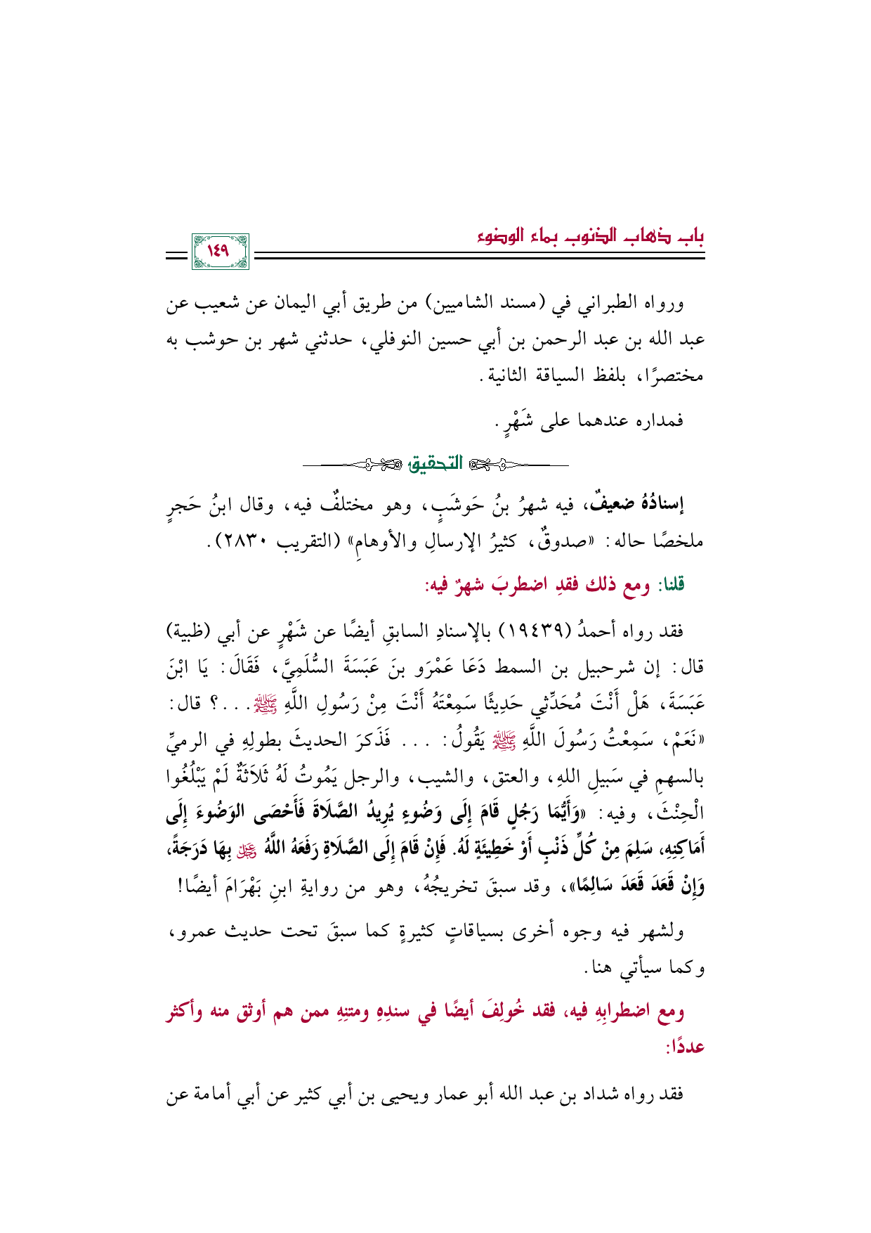 فقد رواه أحمدُ (١٩٤٣٩) بالإسنادِ السابقِ أيضًا عن شَهْرٍ عن أبي (ظبية) قال: إن شرحبيل بن السمط دَعَا عَمْرَو بنَ عَبَسَةَ السُّلَمِيَّ، فَقَالَ: يَا ابْنَ عَبَسَةَ، هَلْ أَنْتَ مُحَدِّثِي حَدِيثًا سَمِعْتَهُ أَنْتَ مِنْ رَسُولِ اللَّهِ صلى الله عليه وسلم ... ؟ قال: " نَعَمْ، سَمِعْتُ رَسُولَ اللَّهِ صلى الله عليه وسلم يَقُولُ: ... فَذَكرَ الحديثَ بطولِهِ في الرميِّ بالسهمِ في سَبيلِ اللهِ، والعتق، والشيب، والرجل يَمُوتُ لَهُ ثَلاثَةٌ لَمْ يَبْلُغُوا الْحِنْثَ، وفيه: «وَأَيُّمَا رَجُلٍ قَامَ إِلَى وَضُوءٍ يُرِيدُ الصَّلَاةَ فَأَحْصَى الوَضُوءَ إِلَى أَمَاكِنِهِ، سَلِمَ مِنْ كُلِّ ذَنْبٍ أَوْ خَطِيئَةٍ لَهُ. فَإِنْ قَامَ إِلَى الصَّلَاةِ رَفَعَهُ اللَّهُ عَزَّ وَجَلَّ بِهَا دَرَجَةً، وَإِنْ قَعَدَ قَعَدَ سَالِمًا»، وقد سبقَ تخريجُهُ، وهو من روايةِ ابنِ بَهْرَامَ أيضًا!