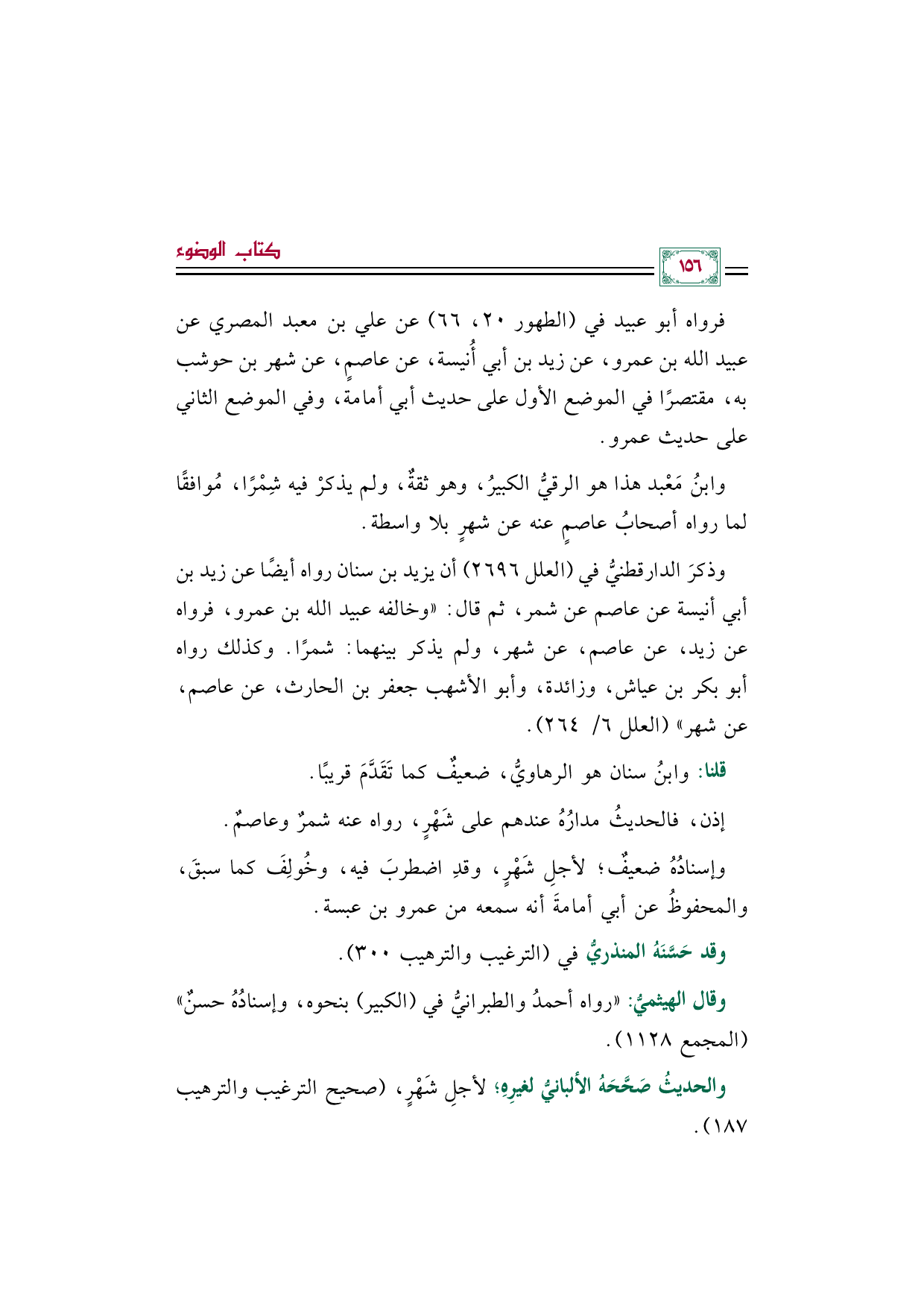 فرواه أبو عبيد في (الطهور ٢٠، ٦٦) عن علي بن معبد المصري عن عبيد الله بن عمرو، عن زيد بن أبي أُنيسة، عن عاصمٍ، عن شهر بن حوشب به، مقتصرًا في الموضع الأول على حديث أبي أمامة، وفي الموضع الثاني على حديث عمرو.