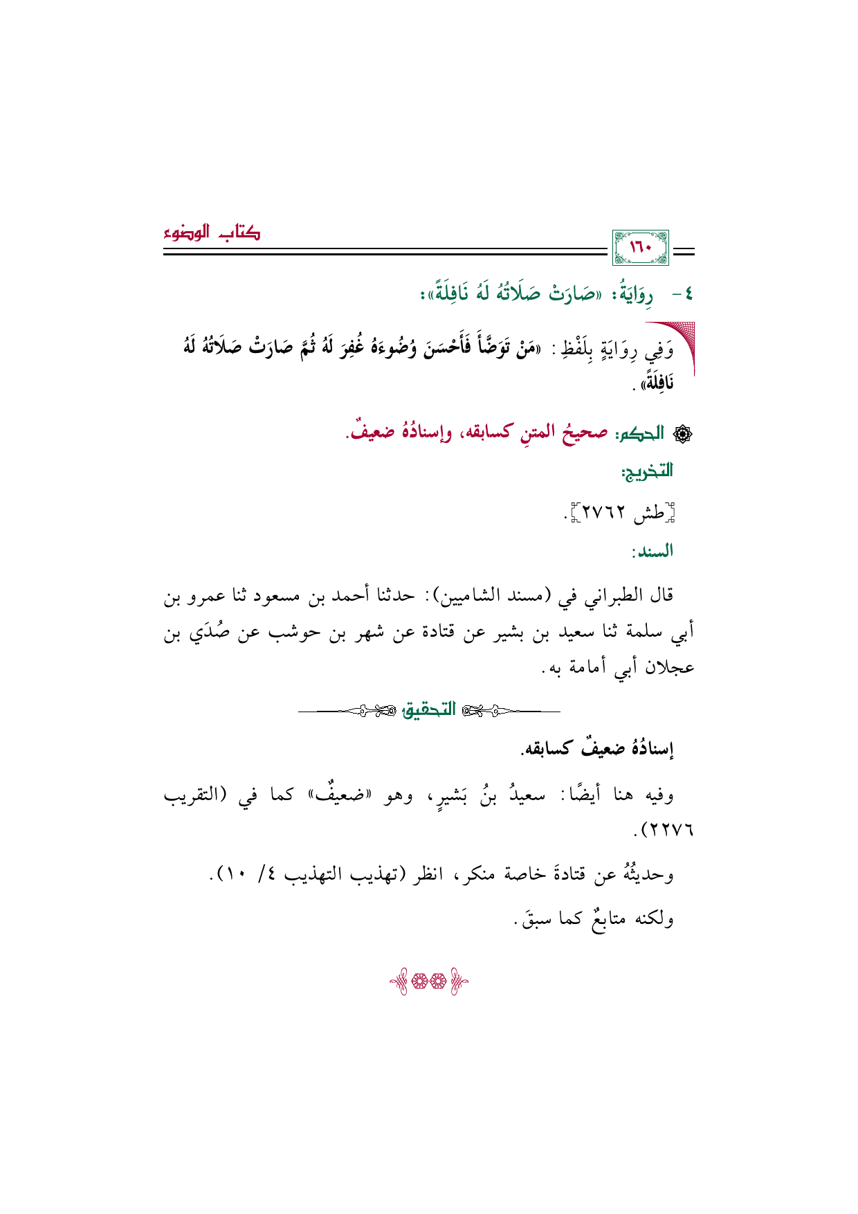 قال الطبراني في (مسند الشاميين): حدثنا أحمد بن مسعود ثنا عمرو بن أبي سلمة ثنا سعيد بن بشير عن قتادة عن شهر بن حوشب عن صُدَي بن عجلان أبي أمامة به.