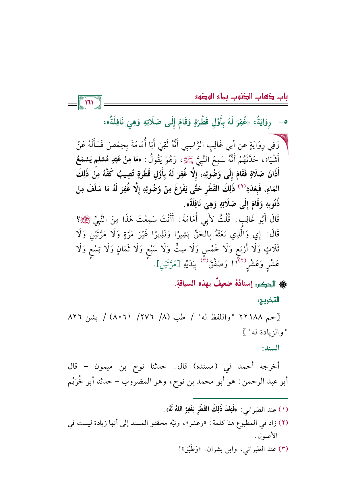 • وَفِي رِوَايَةٍ عن أبي غَالِبٍ الرَّاسِبِي أَنَّهُ لَقِيَ أَبَا أُمَامَةَ بِحِمْصَ فَسَأَلَهُ عَنْ أَشْيَاءَ، حَدَّثَهُمْ أَنَّهُ سَمِعَ النَّبِيَّ صلى الله عليه وسلم، وَهُوَ يَقُولُ: «مَا مِنْ عَبْدٍ مُسْلِمٍ يَسْمَعُ أَذَانَ صَلَاةٍ فَقَامَ إِلَى وَضُوئِهِ، إِلَّا غُفِرَ لَهُ بِأَوَّلِ قَطْرَةٍ تُصِيبُ كَفَّهُ مِنْ ذَلِكَ المَاءِ، فَبِعَدَدِ (¬١) ذَلِكَ القَطْرِ حَتَّى يَفْرُغَ مِنْ وُضُوئِهِ إِلَّا غُفِرَ لَهُ مَا سَلَفَ مِنْ ذُنُوبِهِ وَقَامَ إِلَى صَلَاتِهِ وَهِيَ نَافِلَةٌ».