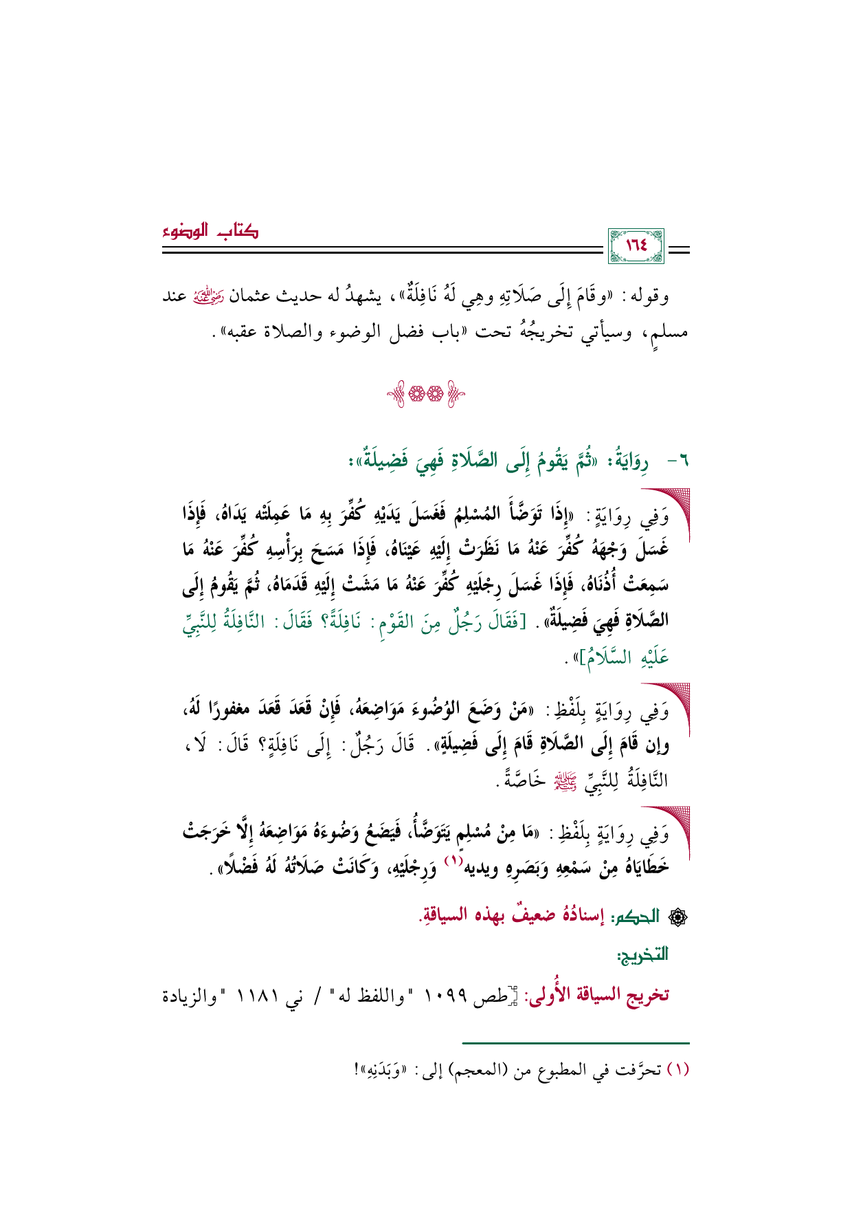 رِوَايَةُ: ثُمَّ يَقُومُ إِلَى الصَّلَاةِ فَهِيَ فَضِيلَةٌ: