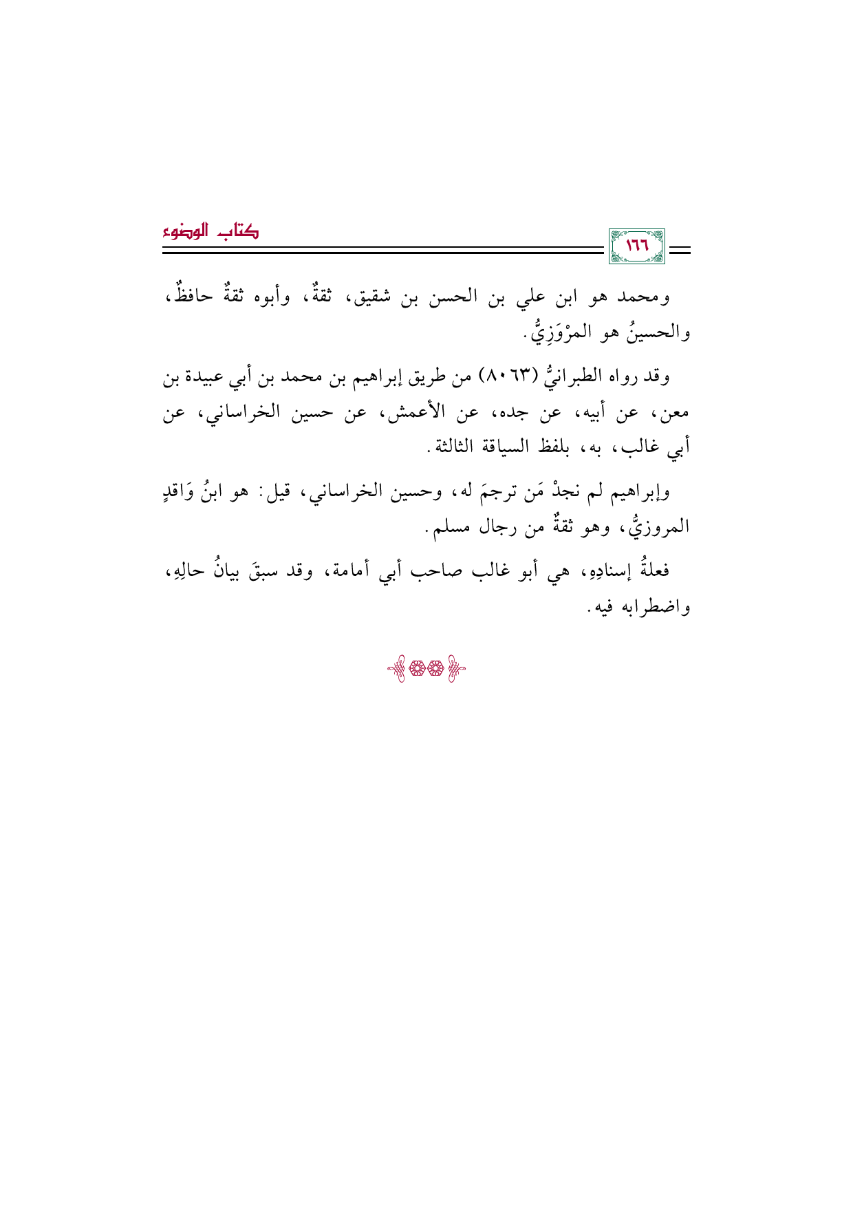 ومحمد هو ابن علي بن الحسن بن شقيق، ثقةٌ، وأبوه ثقةٌ حافظٌ، والحسينُ هو المرْوَزِيُّ.