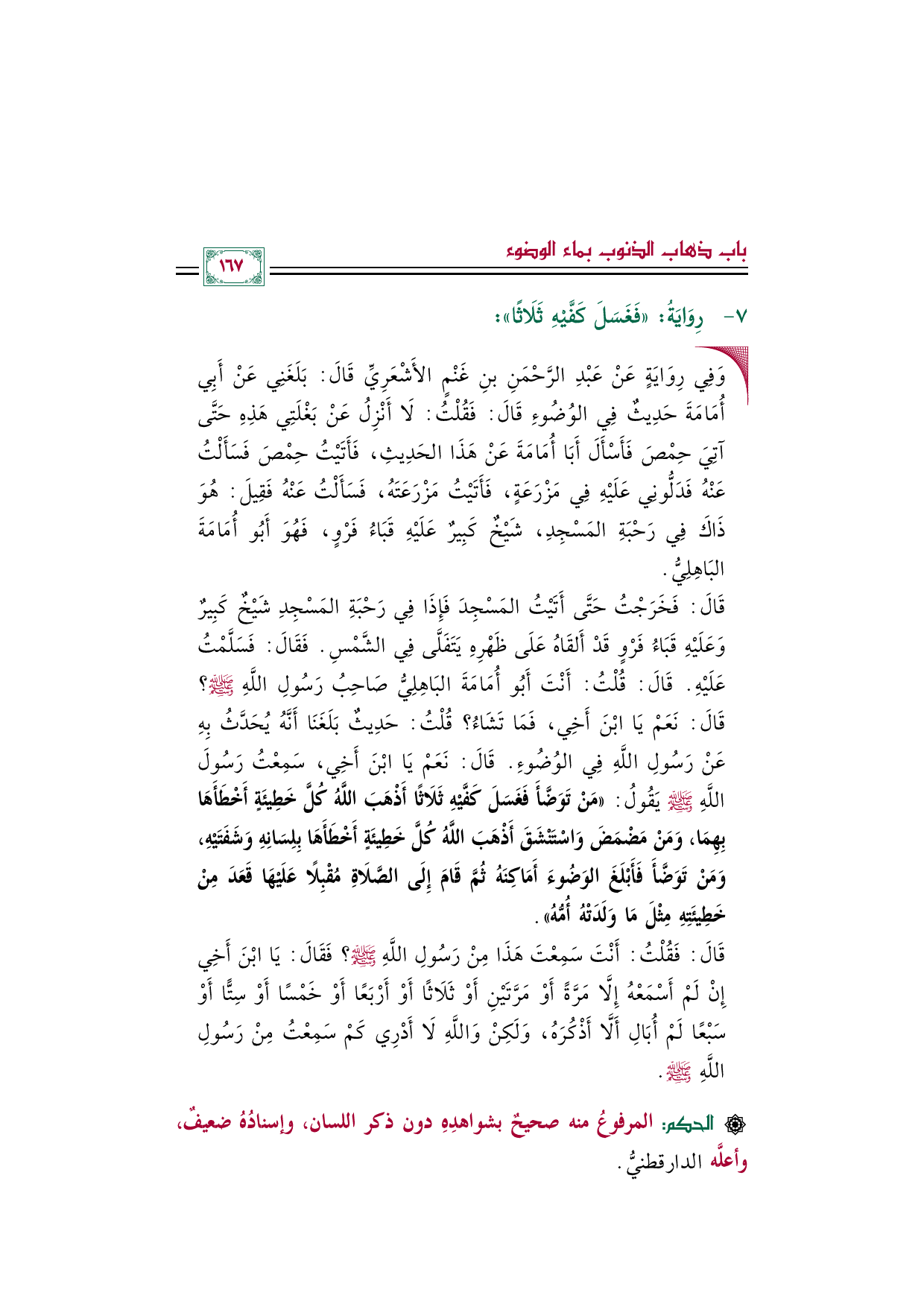 قَالَ: فَخَرَجْتُ حَتَّى أَتَيْتُ المَسْجِدَ فَإِذَا فِي رَحْبَةِ المَسْجِدِ شَيْخٌ كَبِيرٌ وَعَلَيْهِ قَبَاءُ فَرْوٍ قَدْ أَلقَاهُ عَلَى ظَهْرِهِ يَتَفَلَّى فِي الشَّمْسِ. فَقَالَ: فَسَلَّمْتُ عَلَيْهِ. قَالَ: قُلْتُ: أَنْتَ أَبُو أُمَامَةَ البَاهِلِيُّ صَاحِبُ رَسُولِ اللَّهِ صلى الله عليه وسلم؟ قَالَ: نَعَمْ يَا ابْنَ أَخِي، فَمَا تَشَاءُ؟ قُلْتُ: حَدِيثٌ بَلَغَنَا أَنَّهُ يُحَدَّثُ بِهِ عَنْ رَسُولِ اللَّهِ فِي الوُضُوءِ. قَالَ: نَعَمْ يَا ابْنَ أَخِي، سَمِعْتُ رَسُولَ اللَّهِ صلى الله عليه وسلم يَقُولُ: «مَنْ تَوَضَّأَ فَغَسَلَ كَفَّيْهِ ثَلَاثًا أَذْهَبَ اللَّهُ كُلَّ خَطِيئَةٍ أَخْطَأَهَا بِهِمَا، وَمَنْ مَضْمَضَ وَاسْتَنْشَقَ أَذْهَبَ اللَّهُ كُلَّ خَطِيئَةٍ أَخْطَأَهَا بِلِسَانِهِ وَشَفَتَيْهِ، وَمَنْ تَوَضَّأَ فَأَبْلَغَ الوَضُوءَ أَمَاكِنَهُ ثُمَّ قَامَ إِلَى الصَّلَاةِ مُقْبِلًا عَلَيْهَا قَعَدَ مِنْ خَطِيئَتِهِ مِثْلَ مَا وَلَدَتْهُ أُمُّهُ».