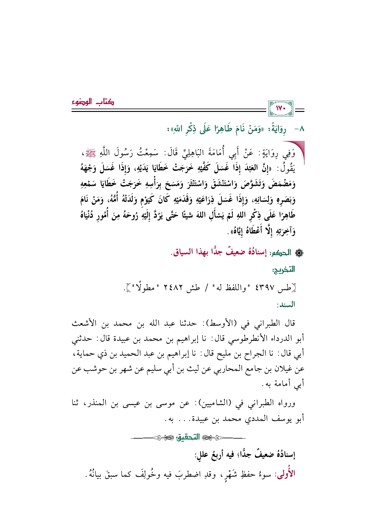 قال الطبراني في (الأوسط): حدثنا عبد الله بن محمد بن الأشعث أبو الدرداء الأنطرطوسي قال: نا إبراهيم بن محمد بن عبيدة قال: حدثني أبي قال: نا الجراح بن مليح قال: نا إبراهيم بن عبد الحميد بن ذي حماية، عن غيلان بن جامع المحاربي عن ليث بن أبي سليم عن شهر بن حوشب عن أبي أمامة به.