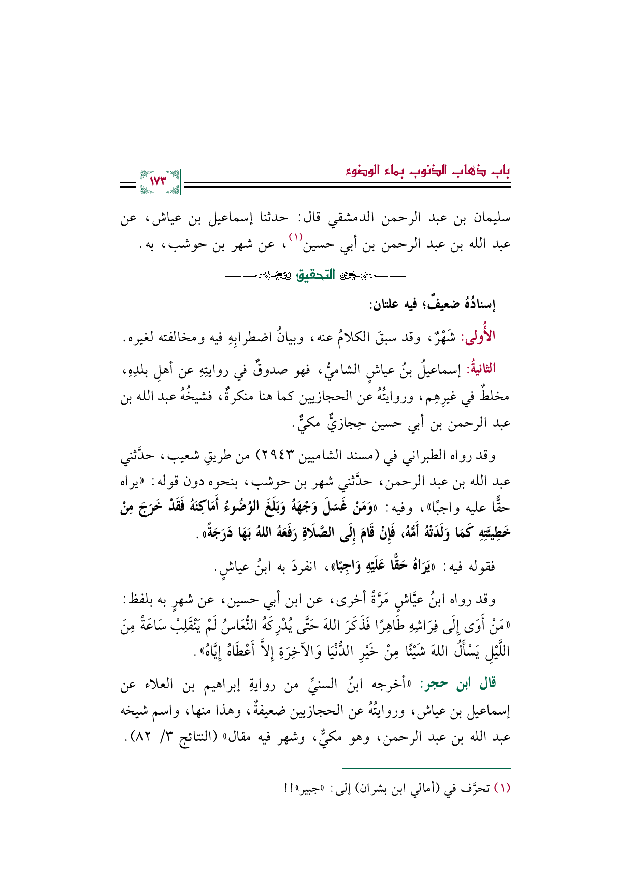 قال ابن حجر: "أخرجه ابنُ السنيِّ من روايةِ إبراهيم بن العلاء عن إسماعيل بن عياش، وروايتُهُ عن الحجازيين ضعيفةٌ، وهذا منها، واسم شيخه عبد الله بن عبد الرحمن، وهو مكيٌّ، وشهر فيه مقال" (النتائج ٣/ ٨٢).