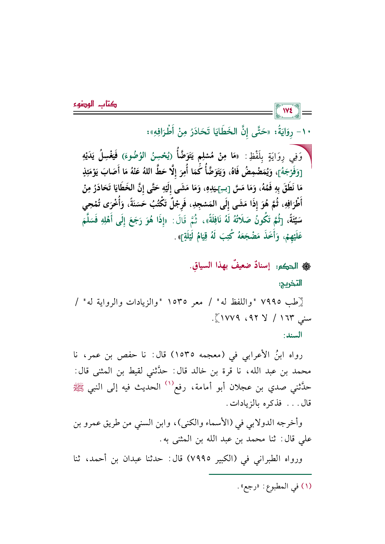 رواه ابنُ الأعرابي في (معجمه ١٥٣٥) قال: نا حفص بن عمر، نا محمد بن عبد الله، نا قرة بن خالد قال: حدَّثني لقيط بن المثنى قال: حدَّثني صدي بن عجلان أبو أمامة، رفع (¬١) الحديث فيه إلى النبي صلى الله عليه وسلم قال ... فذكره بالزيادات.