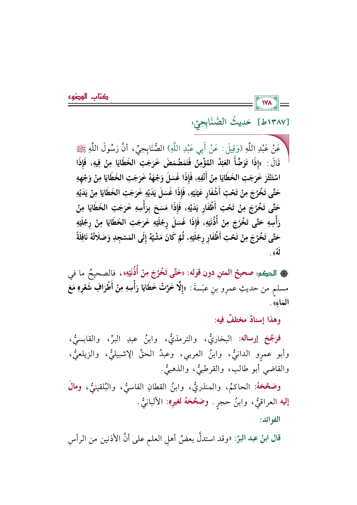 ◼ عَنْ عَبْدِ اللَّهِ (وَقِيلَ: عَنْ أَبِي عَبْدِ اللَّهِ) الصُّنَابِحِيِّ، أنَّ رَسُولَ اللَّهِ صلى الله عليه وسلم قَالَ: «إِذَا تَوَضَّأَ العَبْدُ المُؤْمِنُ فَتَمَضْمَضَ خَرَجَتِ الخَطَايَا مِنْ فِيهِ، فَإِذَا اسْتَنْثَرَ خَرَجَتِ الخَطَايَا مِنْ أَنْفِهِ، فَإِذَا غَسَلَ وَجْهَهُ خَرَجَتِ الخَطَايَا مِنْ وَجْهِهِ حَتَّى تَخْرُجَ مِنْ تَحْتِ أَشْفَارِ عَيْنَيْهِ، فَإِذَا غَسَلَ يَدَيْهِ خَرَجَتِ الخَطَايَا مِنْ يَدَيْهِ حَتَّى تَخْرُجَ مِنْ تَحْتِ أَظْفَارِ يَدَيْهِ، فَإِذَا مَسَحَ بِرَأْسِهِ خَرَجَتِ الخَطَايَا مِنْ رَأْسِهِ حَتَّى تَخْرُجَ مِنْ أُذُنَيْهِ، فَإِذَا غَسَلَ رِجْلَيْهِ خَرَجَتِ الخَطَايَا مِنْ رِجْلَيْهِ حَتَّى تَخْرُجَ مِنْ تَحْتِ أَظْفَارِ رِجْلَيْهِ، ثُمَّ كَانَ مَشْيُهُ إِلَى المَسْجِدِ وَصَلَاتُهُ نَافِلَةً لَهُ».