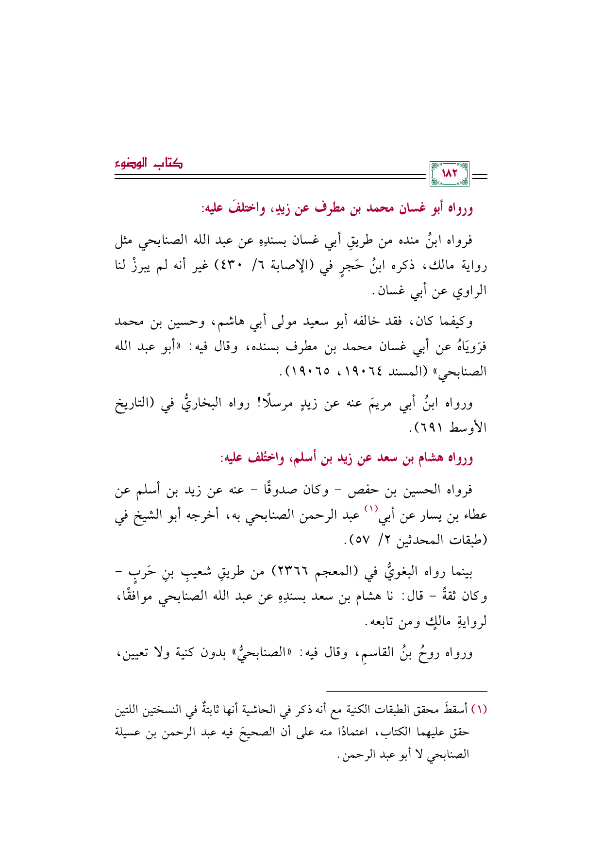 (¬١) أسقطَ محقق الطبقات الكنية مع أنه ذكر في الحاشية أنها ثابتةٌ في النسختين اللتين حقق عليهما الكتاب، اعتمادًا منه على أن الصحيحَ فيه عبد الرحمن بن عسيلة الصنابحي لا أبو عبد الرحمن.