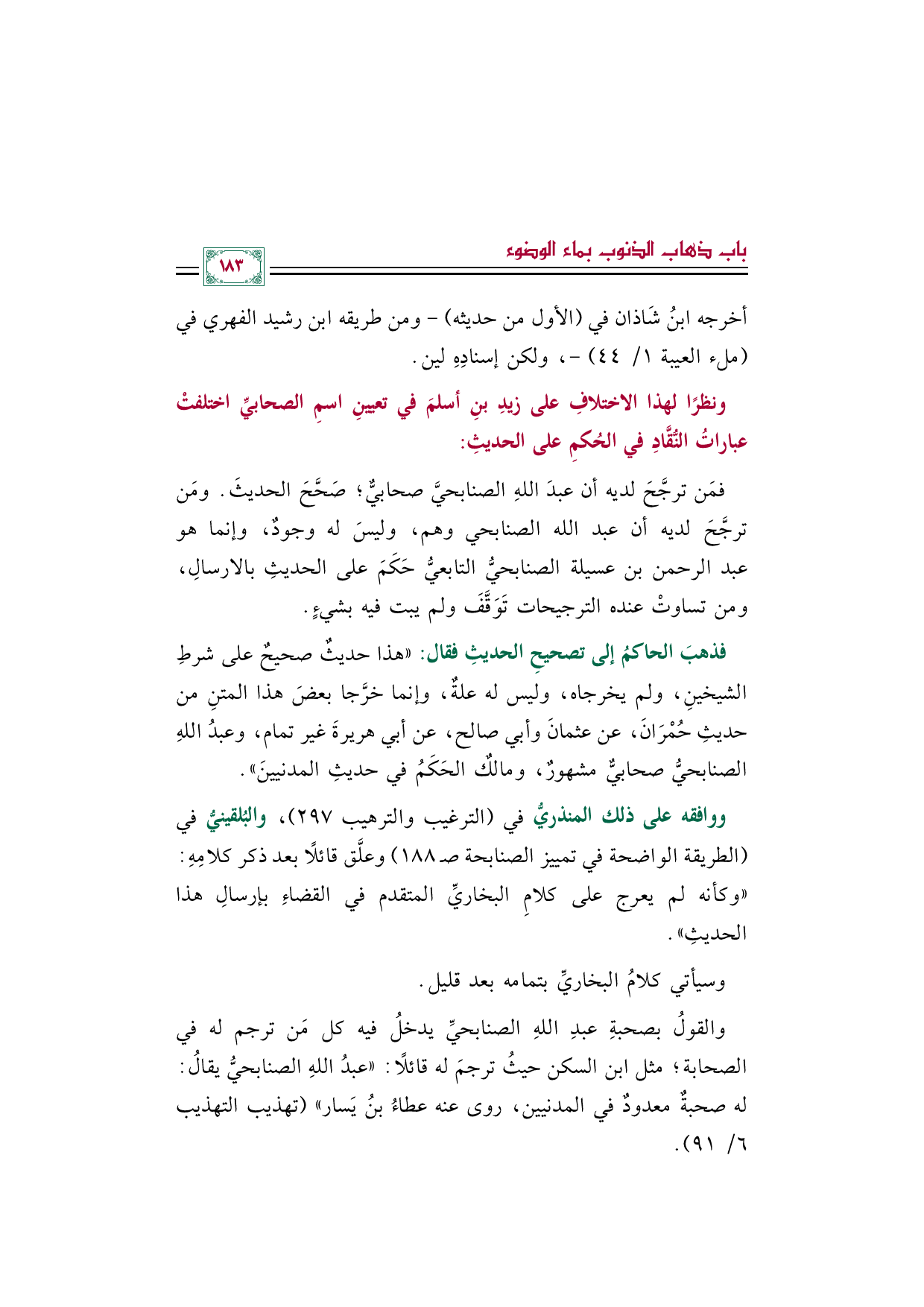 والقولُ بصحبةِ عبدِ اللهِ الصنابحيِّ يدخلُ فيه كل مَن ترجم له في الصحابة؛ مثل ابن السكن حيثُ ترجمَ له قائلًا: "عبدُ اللهِ الصنابحيُّ يقالُ: له صحبةٌ معدودٌ في المدنيين، روى عنه عطاءُ بنُ يَسار" (تهذيب التهذيب ٦/ ٩١).