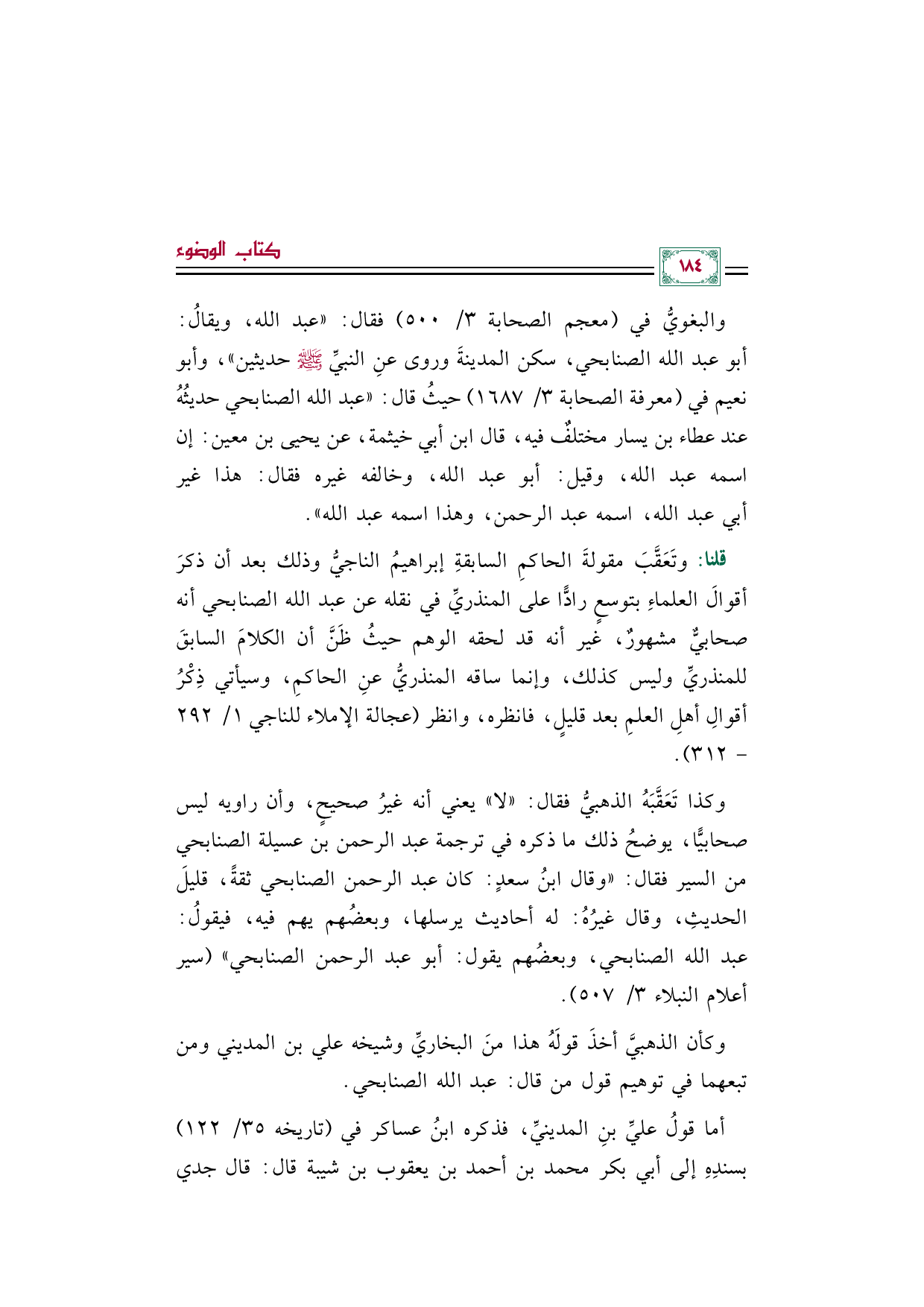 والبغويُّ في (معجم الصحابة ٣/ ٥٠٠) فقال: "عبد الله، ويقالُ: أبو عبد الله الصنابحي، سكن المدينةَ وروى عنِ النبيِّ صلى الله عليه وسلم حديثين"، وأبو نعيم في (معرفة الصحابة ٣/ ١٦٨٧) حيثُ قال: "عبد الله الصنابحي حديثُهُ عند عطاء بن يسار مختلفٌ فيه، قال ابن أبي خيثمة، عن يحيى بن معين: إن اسمه عبد الله، وقيل: أبو عبد الله، وخالفه غيره فقال: هذا غير أبي عبد الله، اسمه عبد الرحمن، وهذا اسمه عبد الله".