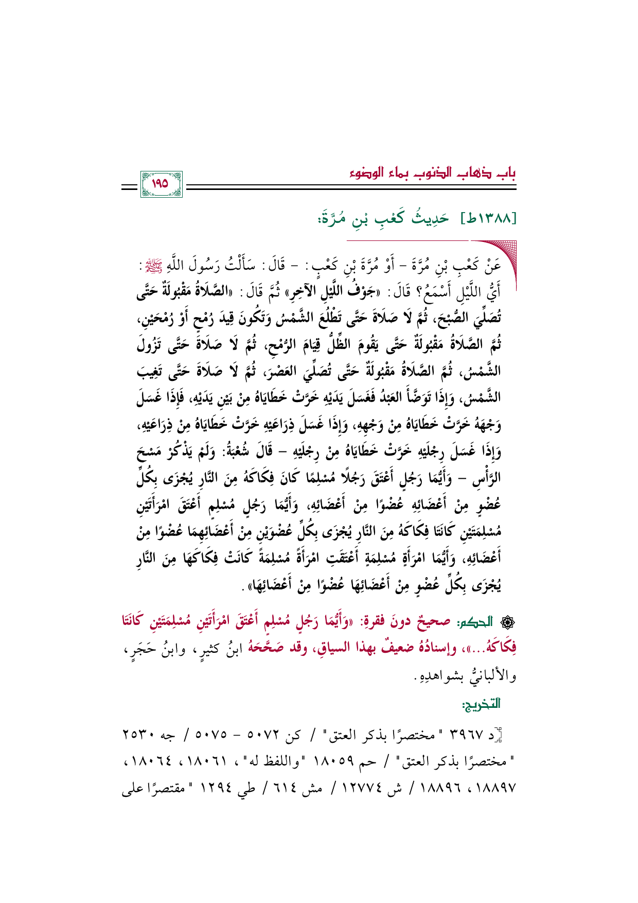 ◼ عَنْ كَعْبِ بْنِ مُرَّةَ -أَوْ مُرَّةَ بْنِ كَعْبٍ: - قَالَ: سَأَلْتُ رَسُولَ اللَّهِ صلى الله عليه وسلم: أَيُّ اللَّيْلِ أَسْمَعُ؟ قَالَ: «جَوْفُ اللَّيْلِ الآخِرِ» ثُمَّ قَالَ: «الصَّلَاةُ مَقْبُولَةٌ حَتَّى تُصَلِّيَ الصُّبْحَ، ثُمَّ لَا صَلَاةَ حَتَّى تَطْلُعَ الشَّمْسُ وَتَكُونَ قِيدَ رُمْحٍ أَوْ رُمْحَيْنِ، ثُمَّ الصَّلَاةُ مَقْبُولَةٌ حَتَّى يَقُومَ الظِّلُّ قِيَامَ الرُّمْحِ، ثُمَّ لَا صَلَاةَ حَتَّى تَزُولَ الشَّمْسُ، ثُمَّ الصَّلَاةُ مَقْبُولَةٌ حَتَّى تُصَلِّيَ العَصْرَ، ثُمَّ لَا صَلَاةَ حَتَّى تَغِيبَ الشَّمْسُ، وَإِذَا تَوَضَّأَ العَبْدُ فَغَسَلَ يَدَيْهِ خَرَّتْ خَطَايَاهُ مِنْ بَيْنِ يَدَيْهِ، فَإِذَا غَسَلَ وَجْهَهُ خَرَّتْ خَطَايَاهُ مِنْ وَجْهِهِ، وَإِذَا غَسَلَ ذِرَاعَيْهِ خَرَّتْ خَطَايَاهُ مِنْ ذِرَاعَيْهِ، وَإِذَا غَسَلَ رِجْلَيْهِ خَرَّتْ خَطَايَاهُ مِنْ رِجْلَيْهِ -قَالَ شُعْبَةُ: وَلَمْ يَذْكُرْ مَسْحَ الرَّأْسِ- وَأَيُّمَا رَجُلٍ أَعْتَقَ رَجُلًا مُسْلِمًا كَانَ فِكَاكَهُ مِنَ النَّارِ يُجْزَى بِكُلِّ عُضْوٍ مِنْ أَعْضَائِهِ عُضْوًا مِنْ أَعْضَائِهِ، وَأَيُّمَا رَجُلٍ مُسْلِمٍ أَعْتَقَ امْرَأَتَيْنِ مُسْلِمَتَيْنِ كَانَتَا فِكَاكَهُ مِنَ النَّارِ يُجْزَى بِكُلِّ عُضْوَيْنِ مِنْ أَعْضَائِهِمَا عُضْوًا مِنْ أَعْضَائِهِ، وَأَيُّمَا امْرَأَةٍ مُسْلِمَةٍ أَعْتَقَتِ امْرَأَةً مُسْلِمَةً كَانَتْ فِكَاكَهَا مِنَ النَّارِ يُجْزَى بِكُلِّ عُضْوٍ مِنْ أَعْضَائِهَا عُضْوًا مِنْ أَعْضَائِهَا».