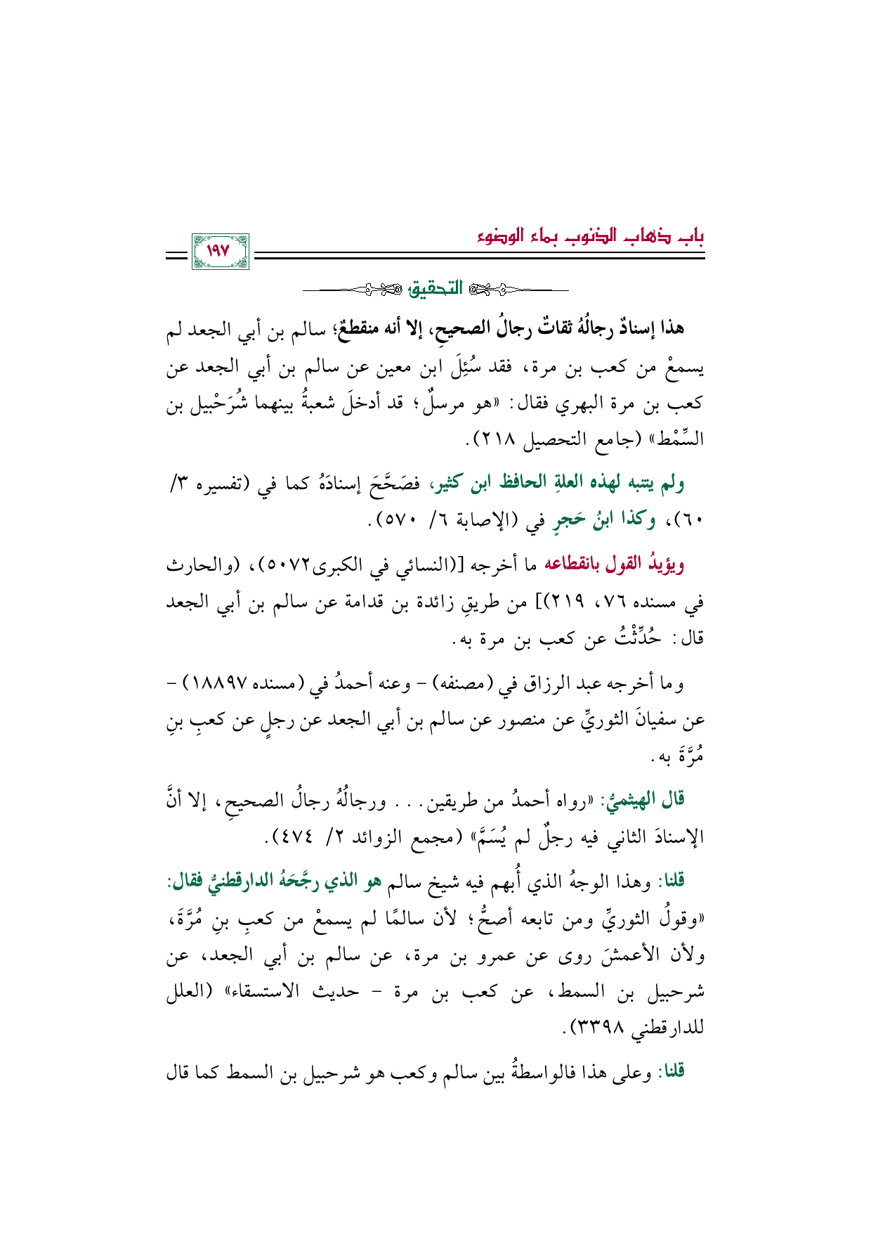 قلنا: وهذا الوجهُ الذي أُبهم فيه شيخ سالم هو الذي رجَّحَهُ الدارقطنيُّ فقال: "وقولُ الثوريِّ ومن تابعه أصحُّ؛ لأن سالمًا لم يسمعْ من كعبِ بنِ مُرَّةَ، ولأن الأعمشَ روى عن عمرو بن مرة، عن سالم بن أبي الجعد، عن شرحبيل بن السمط، عن كعب بن مرة- حديث الاستسقاء" (العلل للدارقطني ٣٣٩٨).