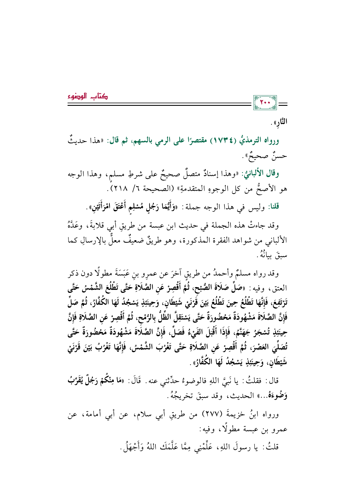 وقد رواه مسلمٌ وأحمدُ من طريقٍ آخرَ عن عمرِو بنِ عَبَسَةَ مطولًا دون ذكر العتق، وفيه: «صَلِّ صَلَاةَ الصُّبْحِ، ثُمَّ أَقْصِرْ عَنِ الصَّلَاةِ حَتَّى تَطْلُعَ الشَّمْسُ حَتَّى تَرْتَفِعَ، فَإِنَّهَا تَطْلُعُ حِينَ تَطْلُعُ بَيْنَ قَرْنَيْ شَيْطَانٍ، وَحِينَئِذٍ يَسْجُدُ لَهَا الكُفَّارُ، ثُمَّ صَلِّ فَإِنَّ الصَّلَاةَ مَشْهُودَةٌ مَحْضُورَةٌ حَتَّى يَسْتَقِلَّ الظِّلُّ بِالرُّمْحِ، ثُمَّ أَقْصِرْ عَنِ الصَّلَاةِ فَإِنَّ حِينَئِذٍ تُسْجَرُ جَهَنَّمُ، فَإِذَا أَقْبَلَ الفَيْءُ فَصَلِّ، فَإِنَّ الصَّلَاةَ مَشْهُودَةٌ مَحْضُورَةٌ حَتَّى تُصَلِّيَ العَصْرَ، ثُمَّ أَقْصِرْ عَنِ الصَّلَاةِ حَتَّى تَغْرُبَ الشَّمْسُ، فَإِنَّهَا تَغْرُبُ بَيْنَ قَرْنَيْ شَيْطَانٍ، وَحِينَئِذٍ يَسْجُدُ لَهَا الكُفَّارُ».