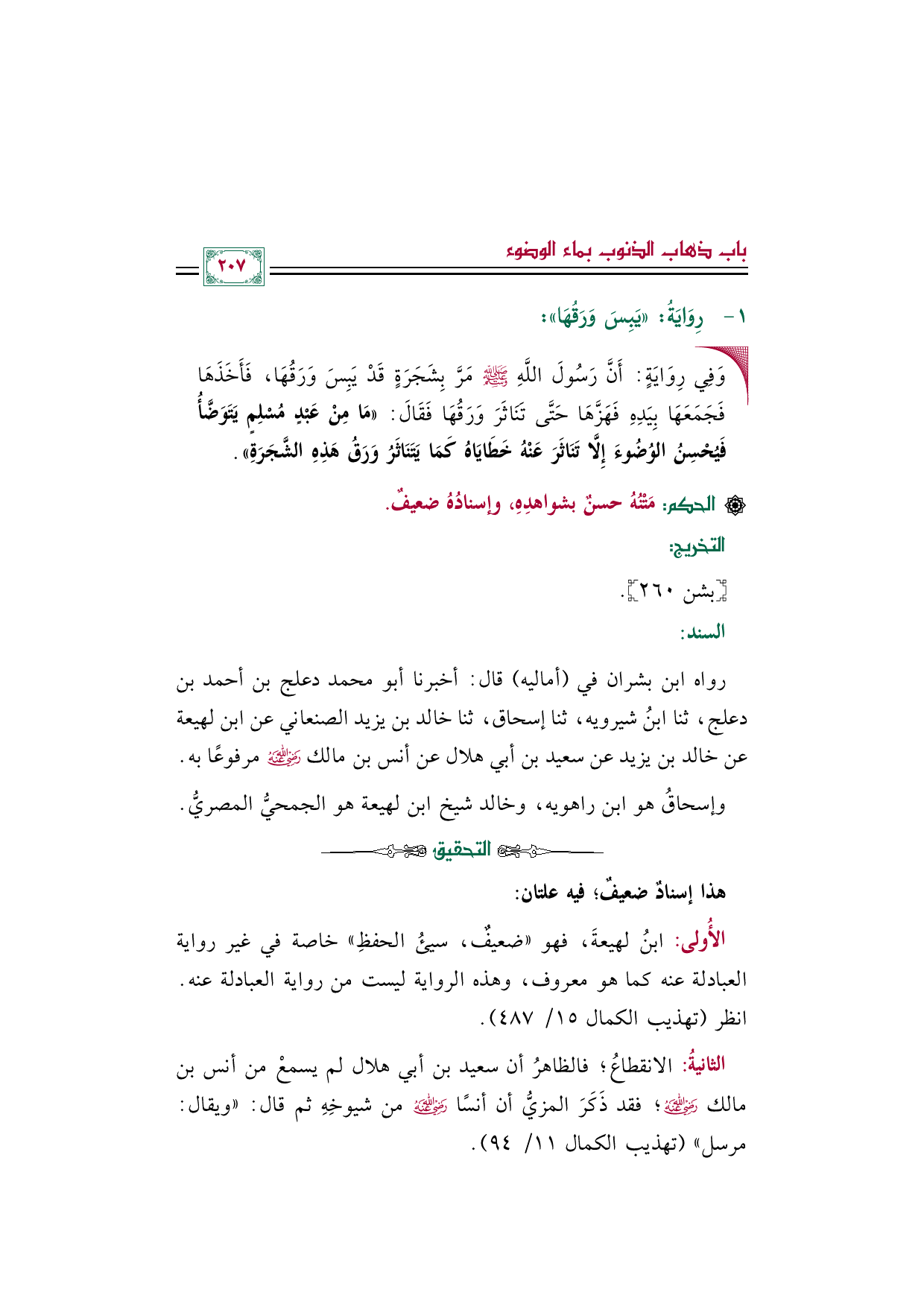الأُولى: ابنُ لهيعةَ، فهو "ضعيفٌ، سيئُ الحفظِ" خاصة في غير رواية العبادلة عنه كما هو معروف، وهذه الرواية ليست من رواية العبادلة عنه. انظر (تهذيب الكمال ١٥/ ٤٨٧).