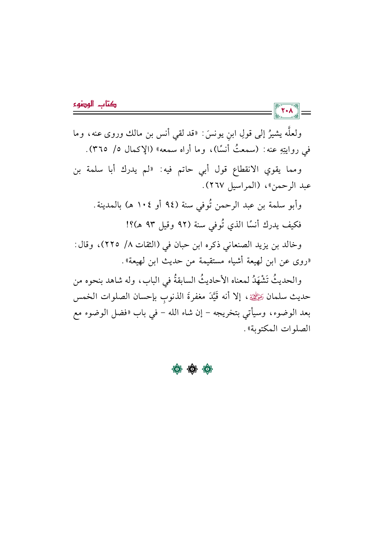 ومما يقوي الانقطاع قول أبي حاتم فيه: "لم يدرك أبا سلمة بن عبد الرحمن"، (المراسيل ٢٦٧).