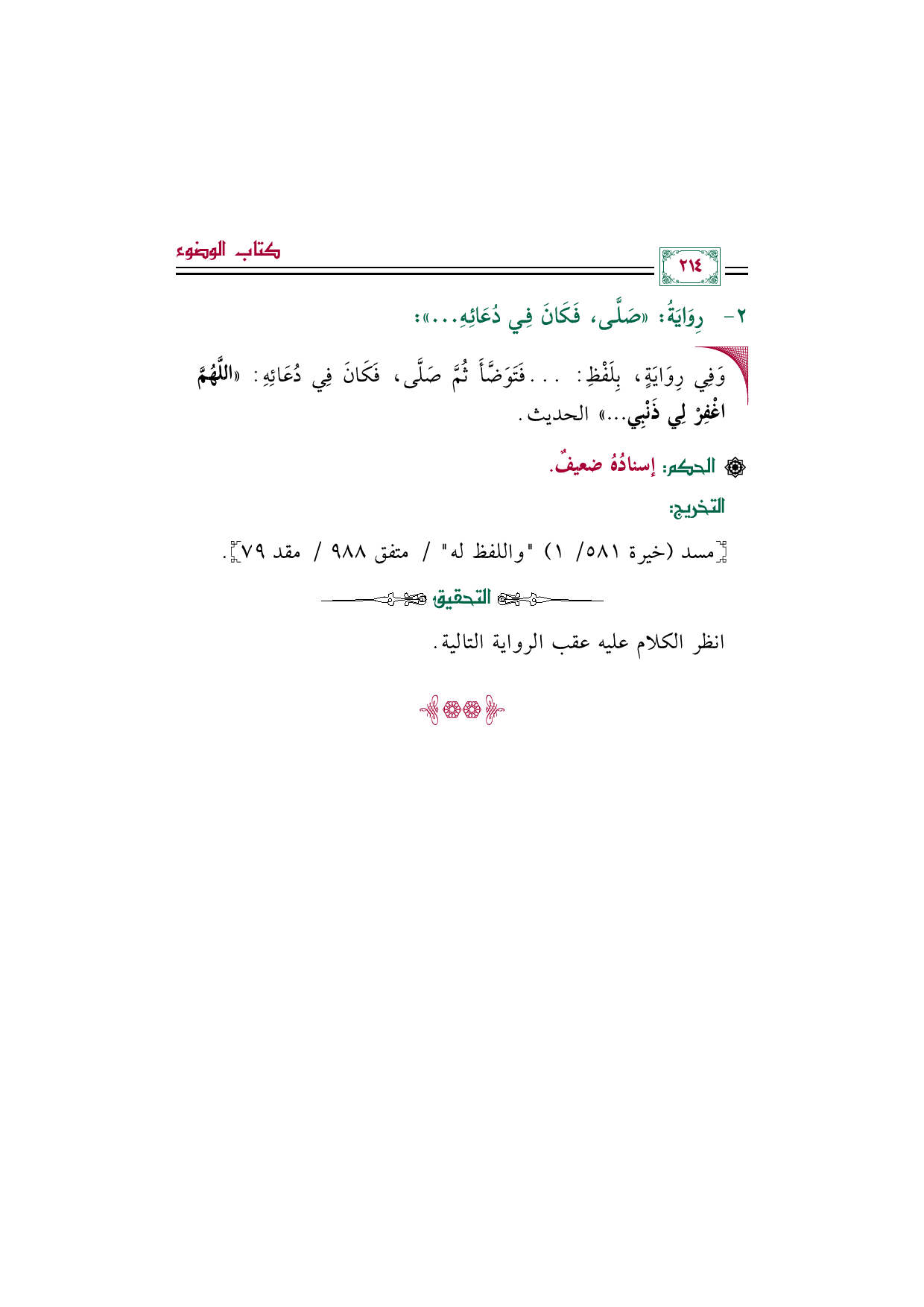 • وَفِي رِوَايَةٍ، بِلَفْظِ: ... فَتَوَضَّأَ ثُمَّ صَلَّى، فَكَانَ فِي دُعَائِهِ: «اللَّهُمَّ اغْفِرْ لِي ذَنْبِي ... » الحديث.